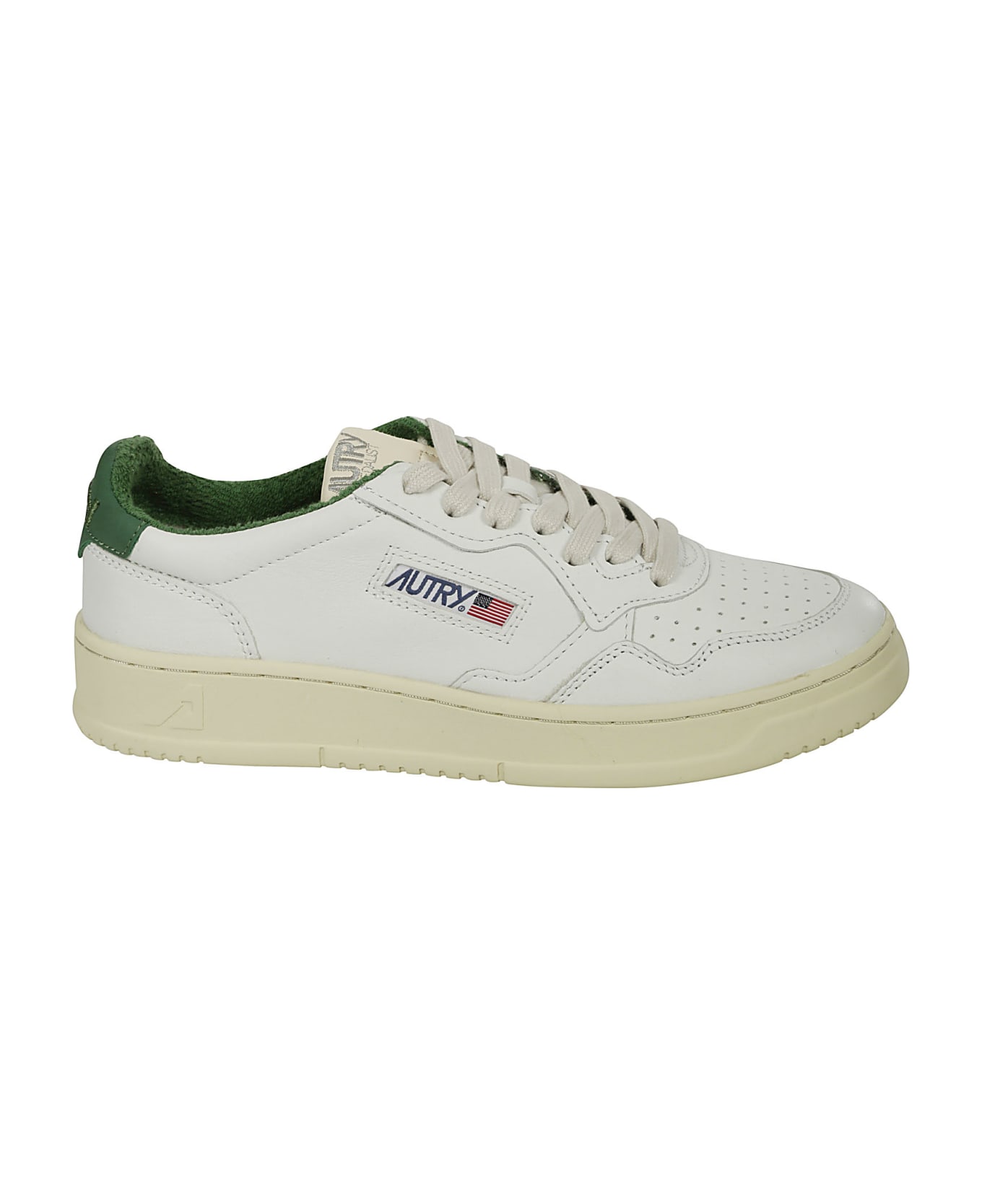 Autry Sneaker in white leather, green insert on the back, logo detail, perforated toe, rubber sole. Composition: 85% + Cow Leather, 5% +