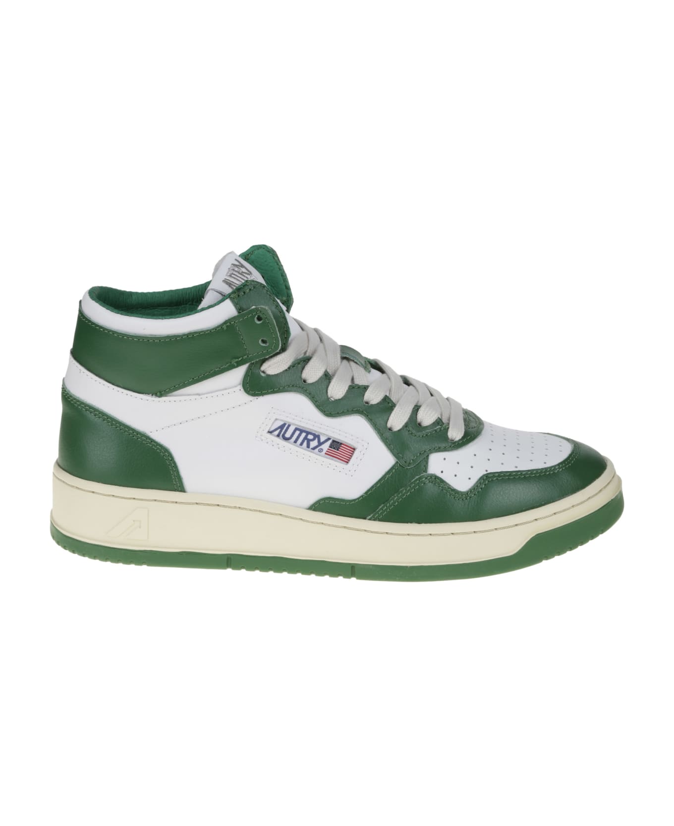 Autry Sneaker in white and green leather, logo detail, rubber sole.