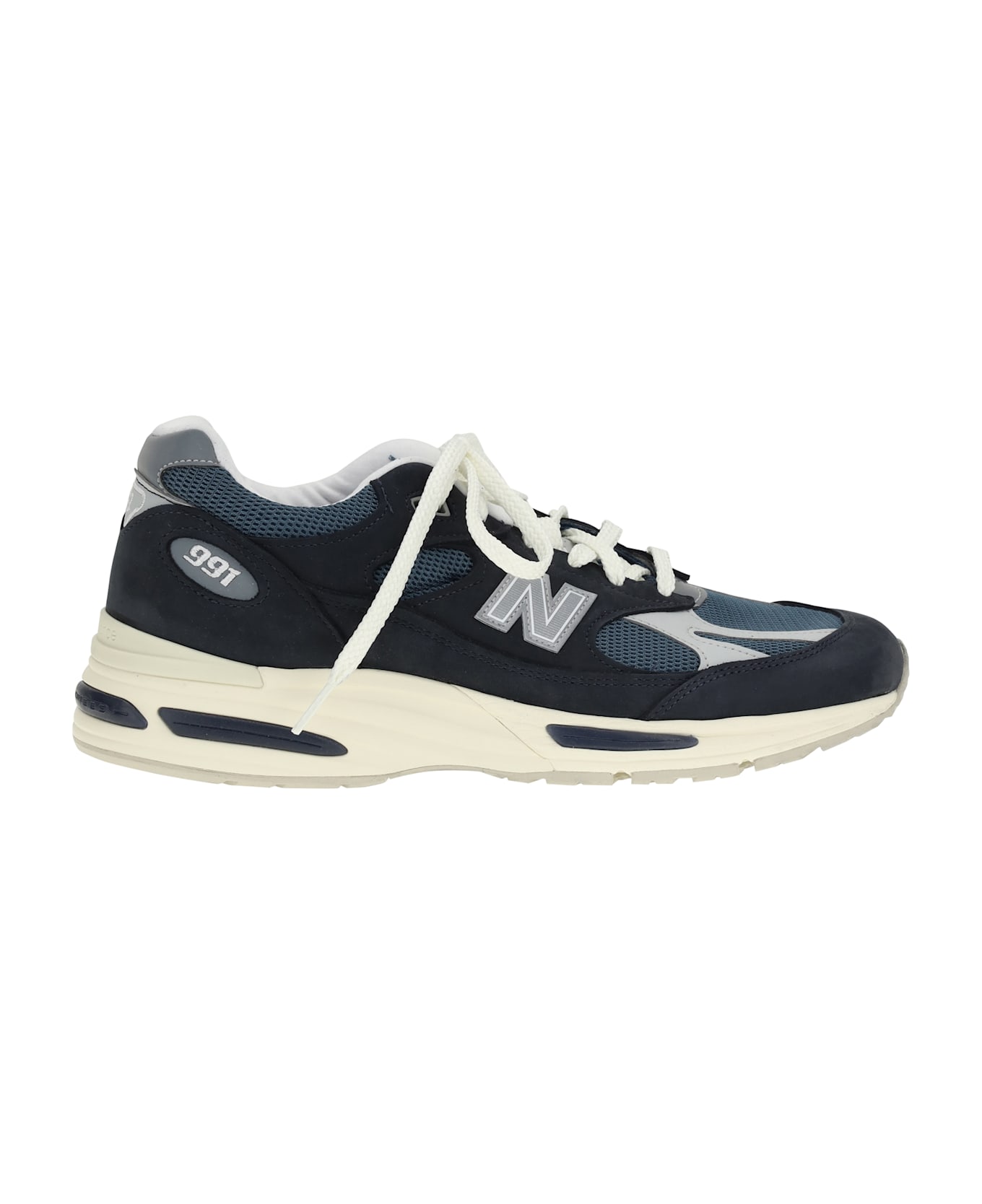 New balance's 991 sneakers combine contemporary style and comfort. the mesh upper with suede details ensures breathability and durability. the lace-up front closure ensures a stable fit, while the extended toe box gives a dynamic look. raised, reinforced rubber outsole provides cushioning and support. the iconic contrasting monogram on the side panels and the branded front tab complete the design with a distinctive touch.