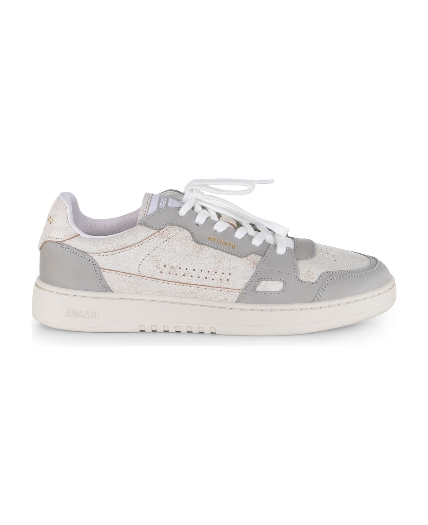 Axel Arigato "Dice Lo" sneakers made of Beige leather. Details in Grey suede leather. Breathable round toe. Logo patch applied on the tongue. Lace-up. White flat laces. Contrasting Gold "Arigato" logo lettering engraved on the side. Padded, removable insole. Worn effect on the side. Rubber sole. Tone-on-tone logo lettering on the side. Sole 100% Rubber 100% Leather Composition: Pelle