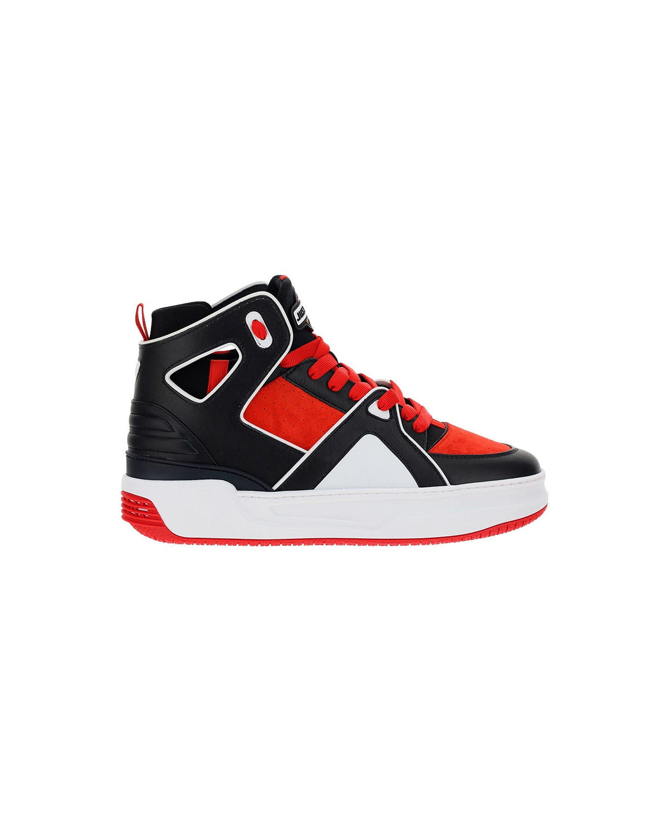 Calfskin basketball sneakers by just done, round toe, front lace-up closure, side panels with geometric design, suede design, contrasting embossed brand logo patch on front tongue, geometric details on heel, logo-embossed insole.