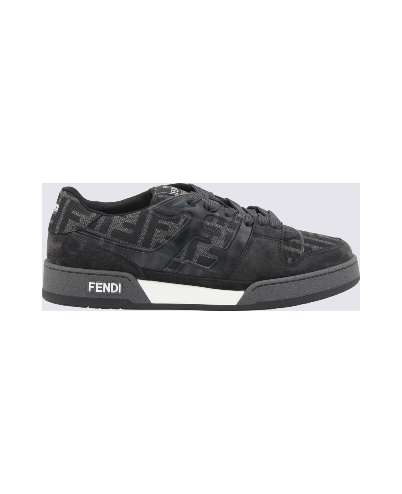 Black and grey suede Match sneakers from Fendi featuring round toe, cotton lace-up fastening, all over monogram, logo on the tongue, rubber sole and logo on the sole.