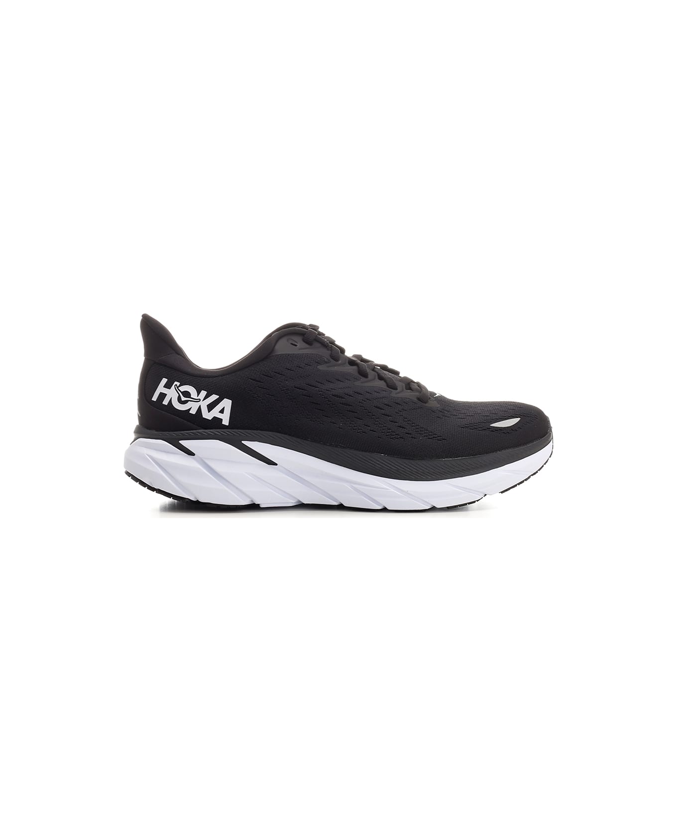 Black "Clifton 8" sneakers in mesh fabric with side logo patch and white rubber sole from Hoka.