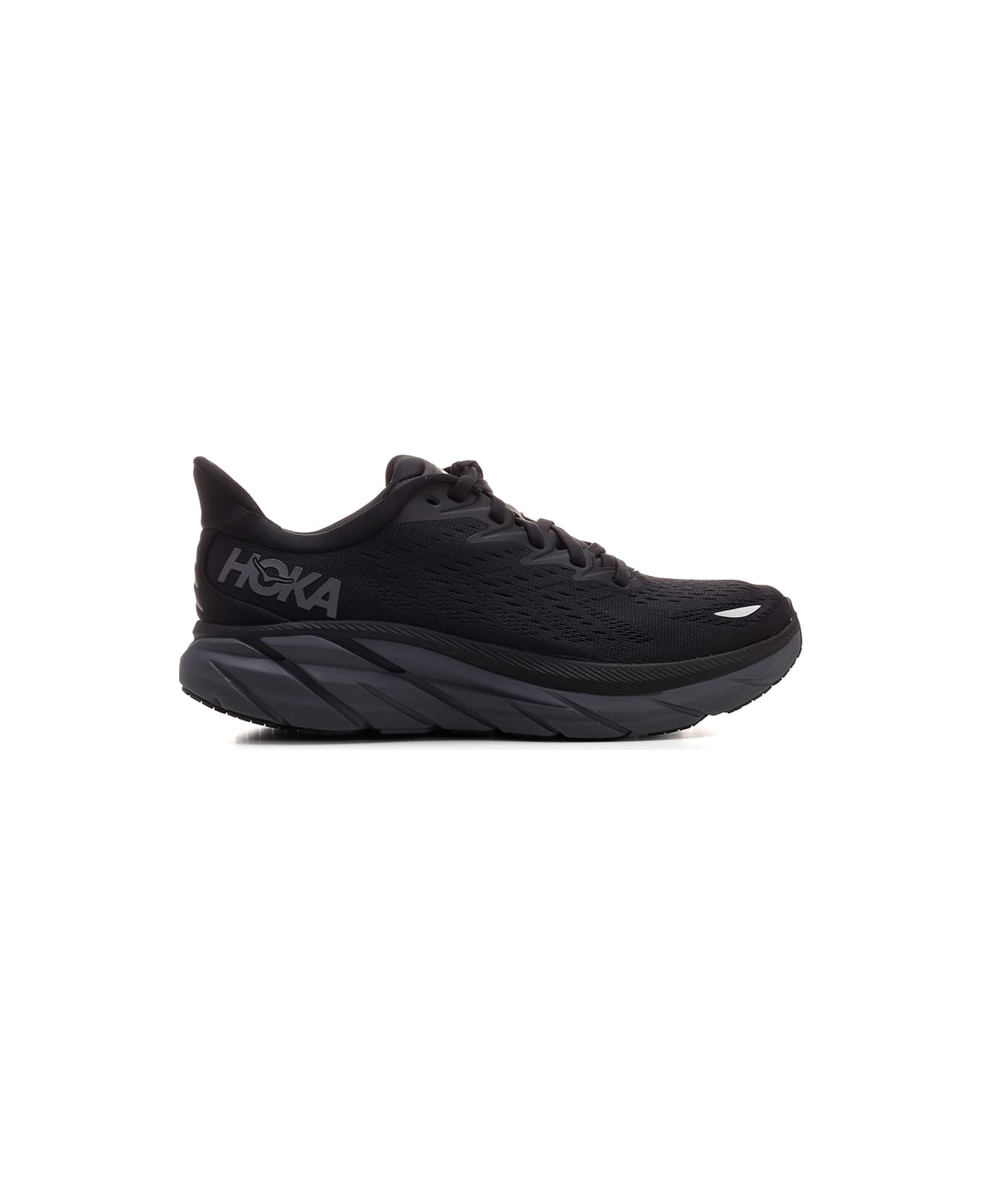 Black "Clifton 8" sneakers in tech mesh fabric with side logo patch and rubber sole from Hoka.