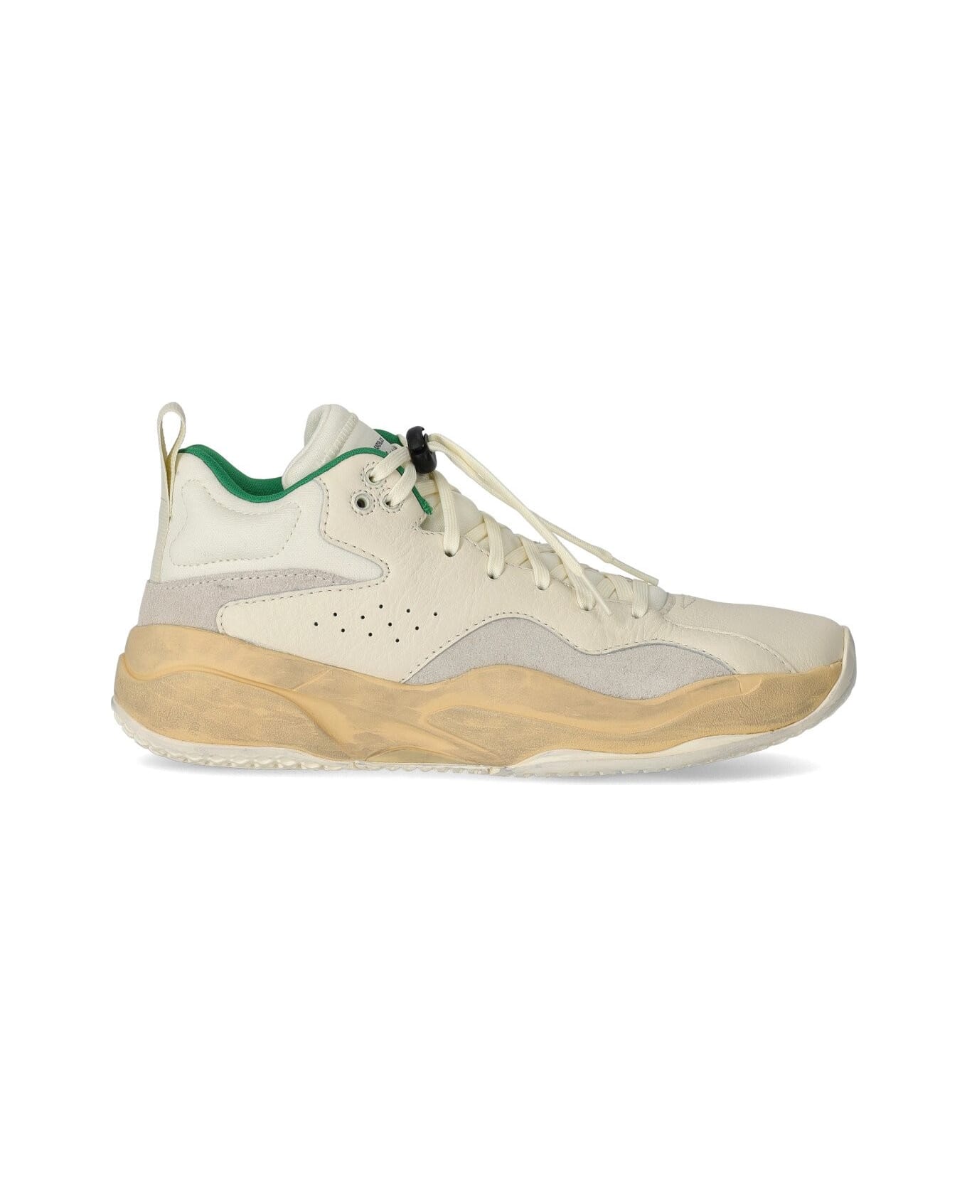 Brandblack Villain Dirty sneaker made of cream-colored leather, suède and neoprene with contrasting green interior. Tongue with logo, neoprene lining and fabric insole. Drawstring fastening and used effect rubber sole, height 3 cm. This product has a small fit, we recommend buying one size larger than usual.