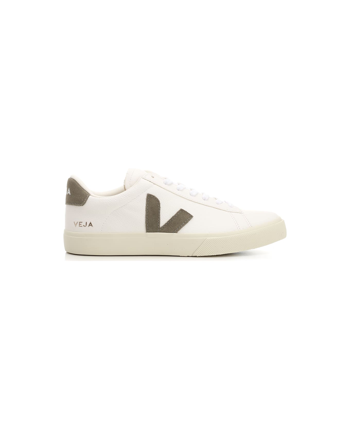 White leather 'Campo' sneakers by Veja with rubber sole and khaki green leather logo and heel.