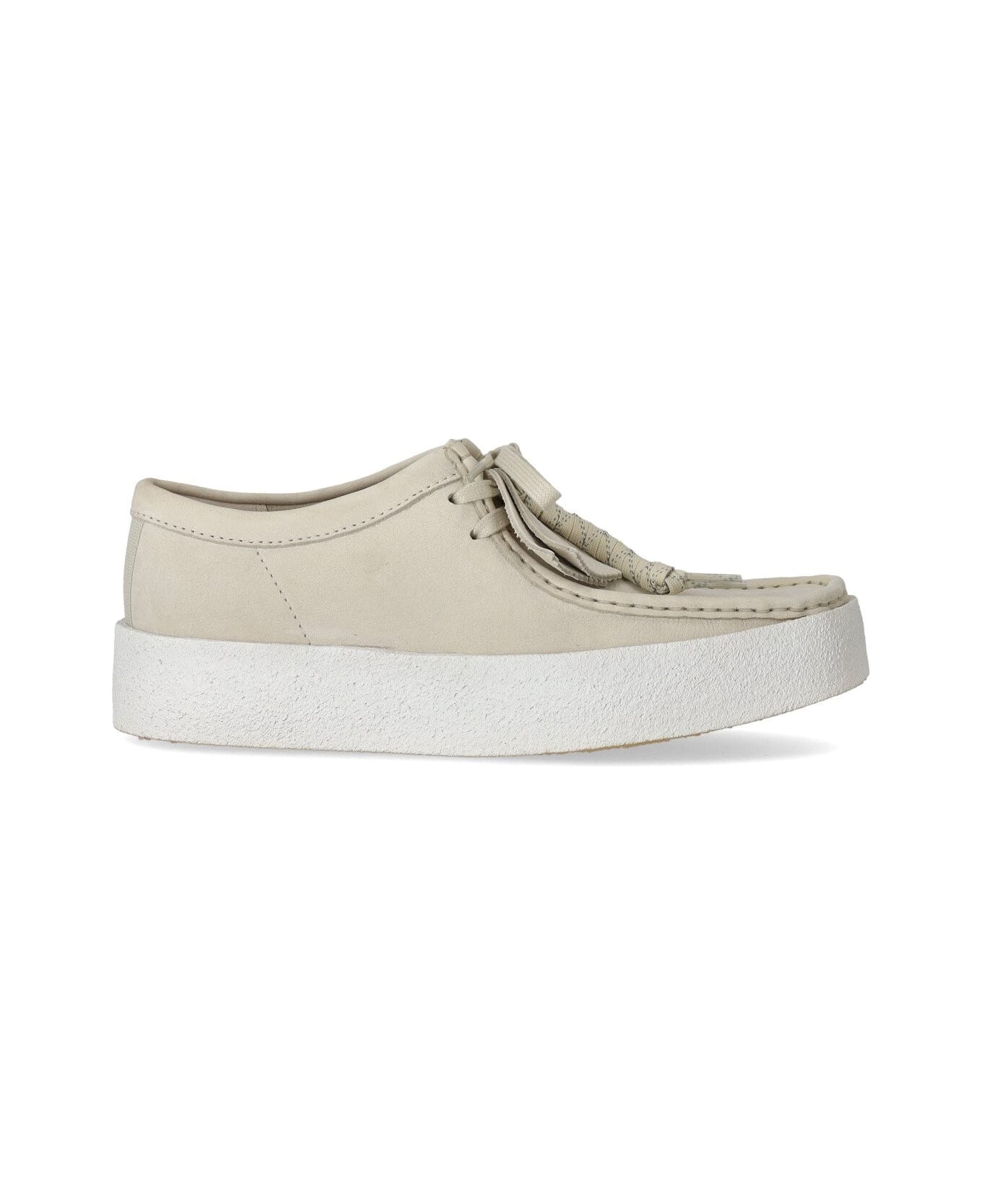 Clarks Wallabee Cup loafer made of ivory-colored nubuck leather, featuring front lacing, square toe and white para platform sole, height 4 cm.