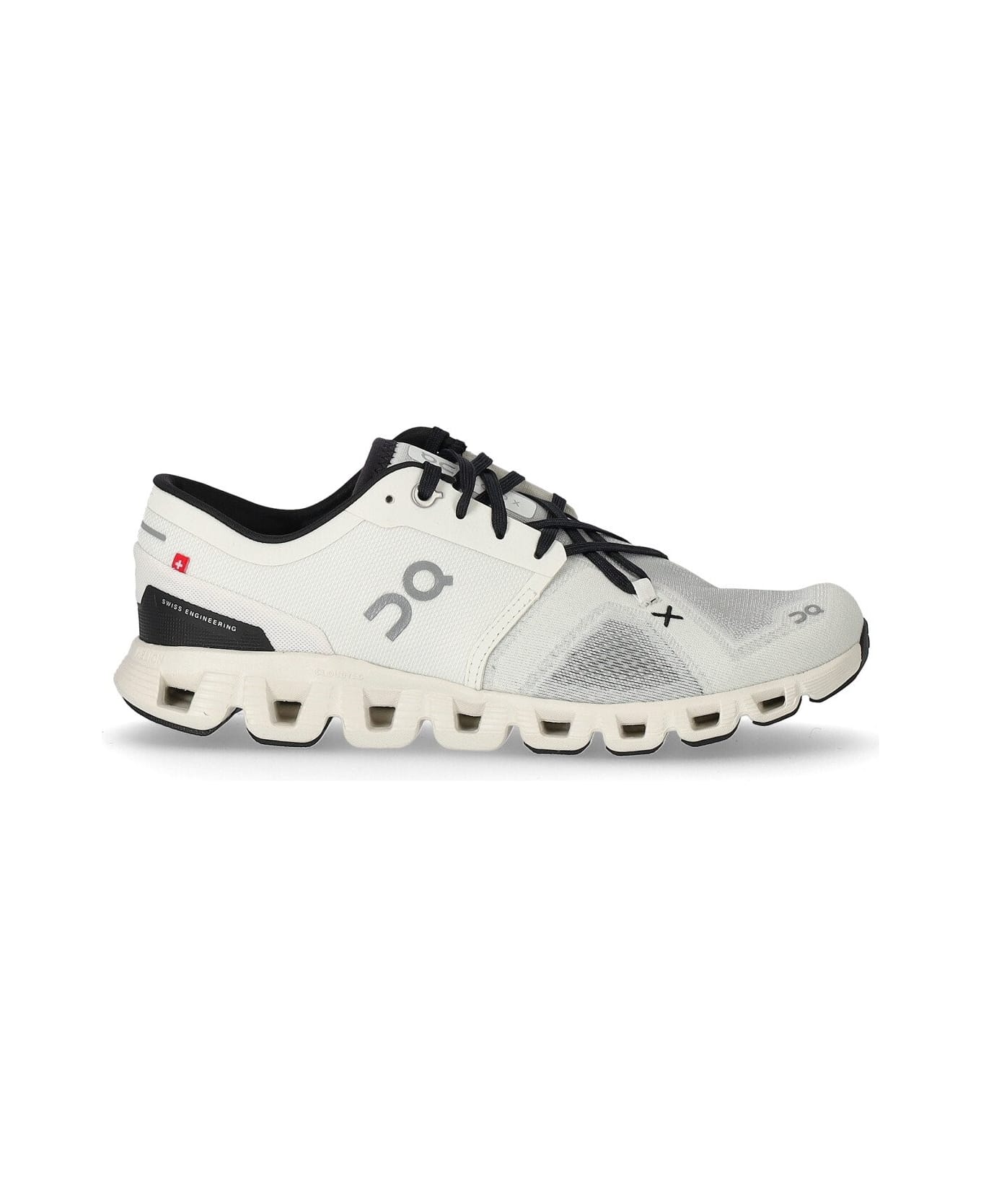 Cloud X 3 sneaker by On made of breathable mesh in shades of ivory and black, with reflective inserts and crossed laces. Removable insole, minimal cushioning for a faster and more responsive running experience, 8 mm heel-to-forefoot drop, weight 243 g. Rubber sole, height 4 cm.