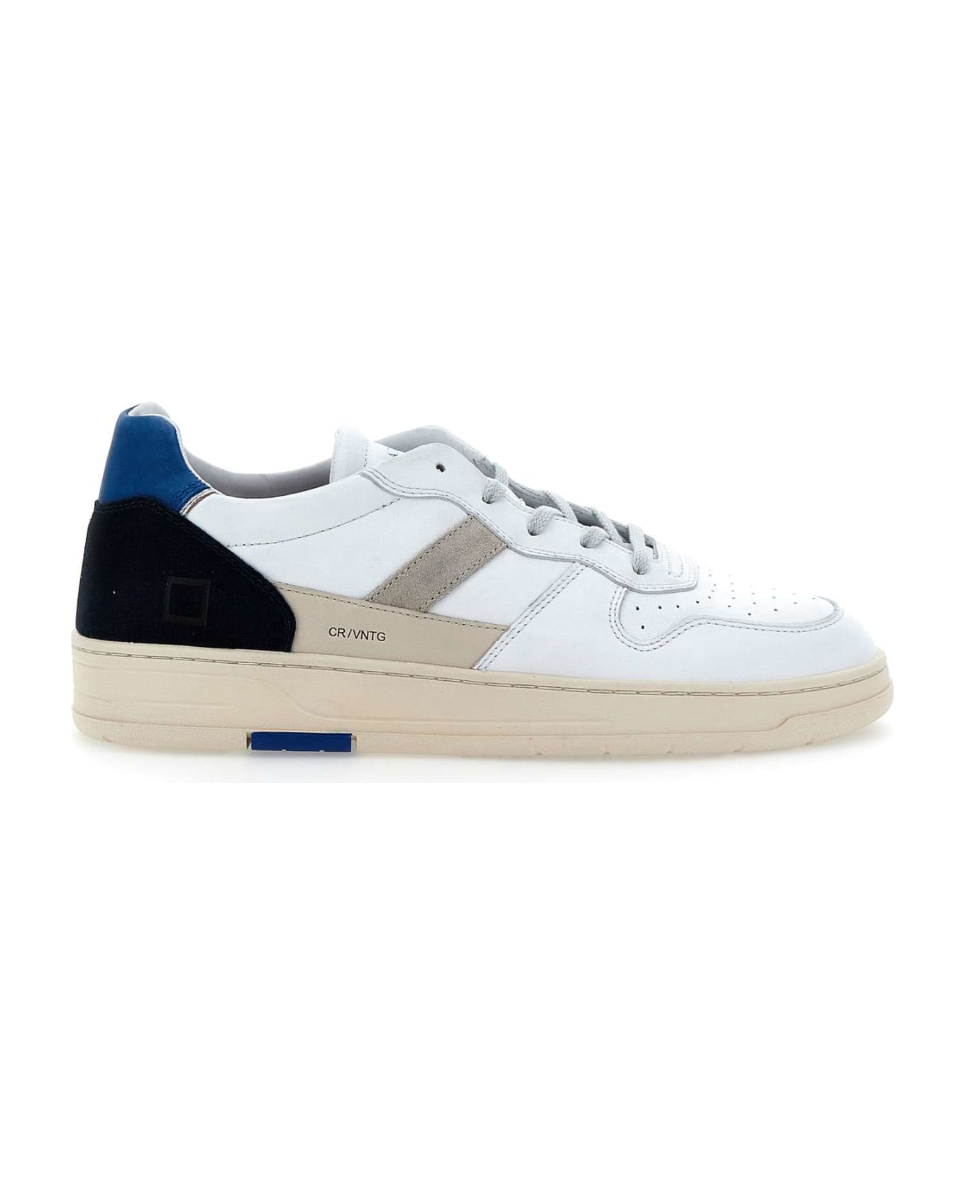 D. A. T. E "Court 2. 0 Vintage" men's leather sneakers, white, flat laces, side square logo, lining in leather and cotton sponge, back in suede and leather in shades of blue, logo embossed on tongue, side band in beige suede, holes to facilitate breathability, 2. 5 cm internal fussbett, 3cm high rubber sole.