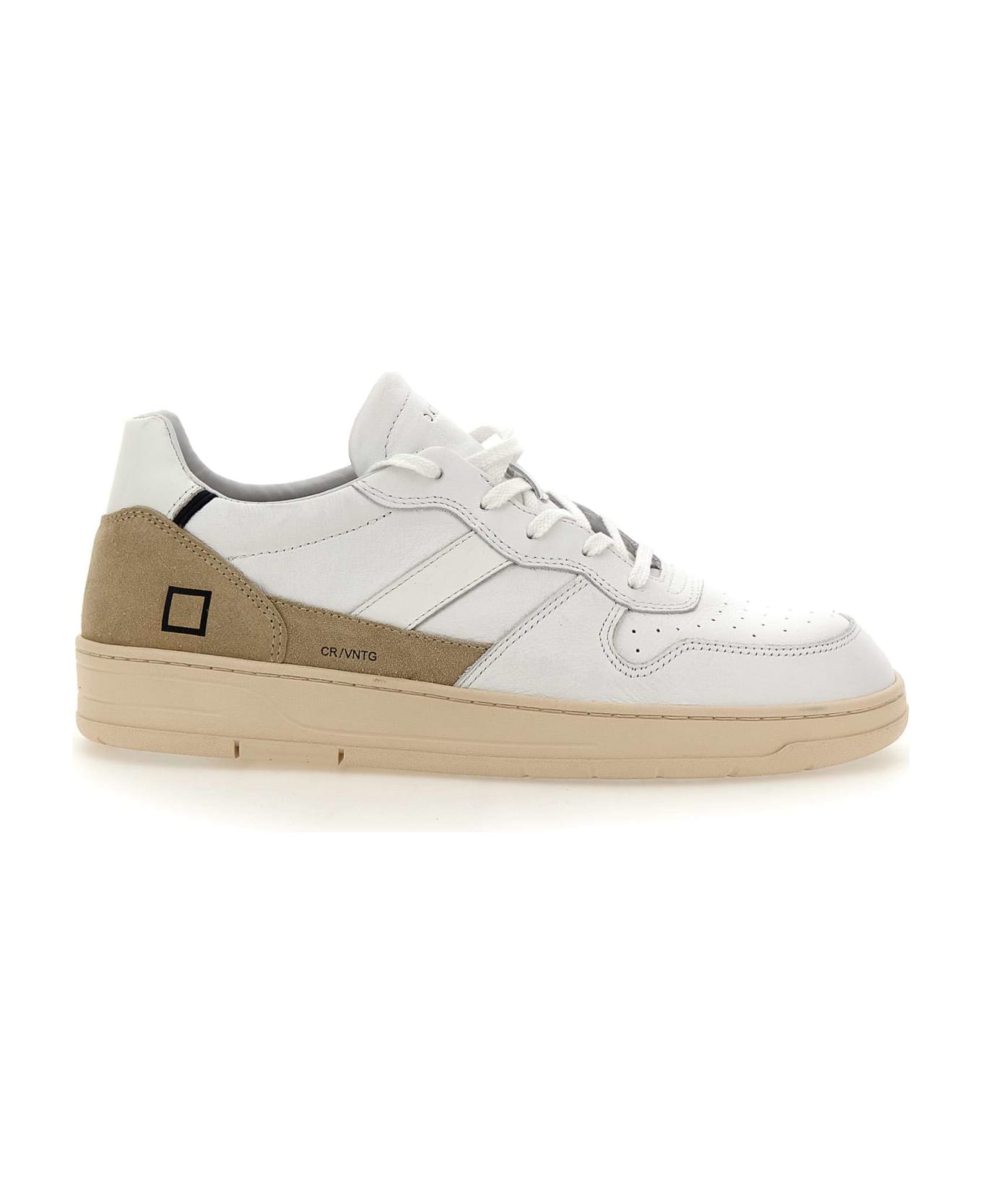 D. A. T. E "Court 2. 0 Vintage" men's leather sneakers, white, flat laces same color, side square logo,lining in leather and cotton terry, back in beige sand suede, logo embossed on tongue, holes for perspiration, 2. 5 cm internal fussbett, 3cm high rubber sole.