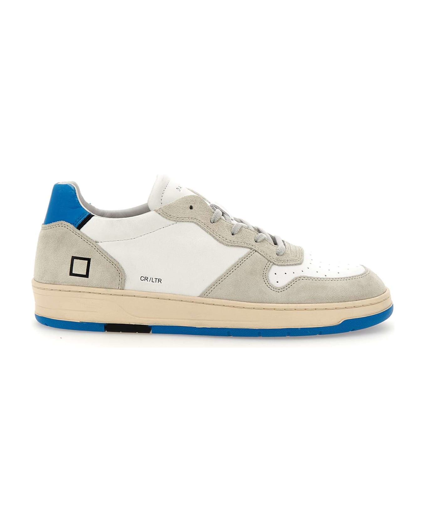 D. A. T. E "Court Leather" men's leather sneakers, white and grey, suede inserts, white flat laces, logo on tongue and side, contrasting bluette back patch, side square logo, leather and cotton terry lining, 2. 5 cm internal fussbett, holes for breathability, 3cm high bicolor rubber sole.