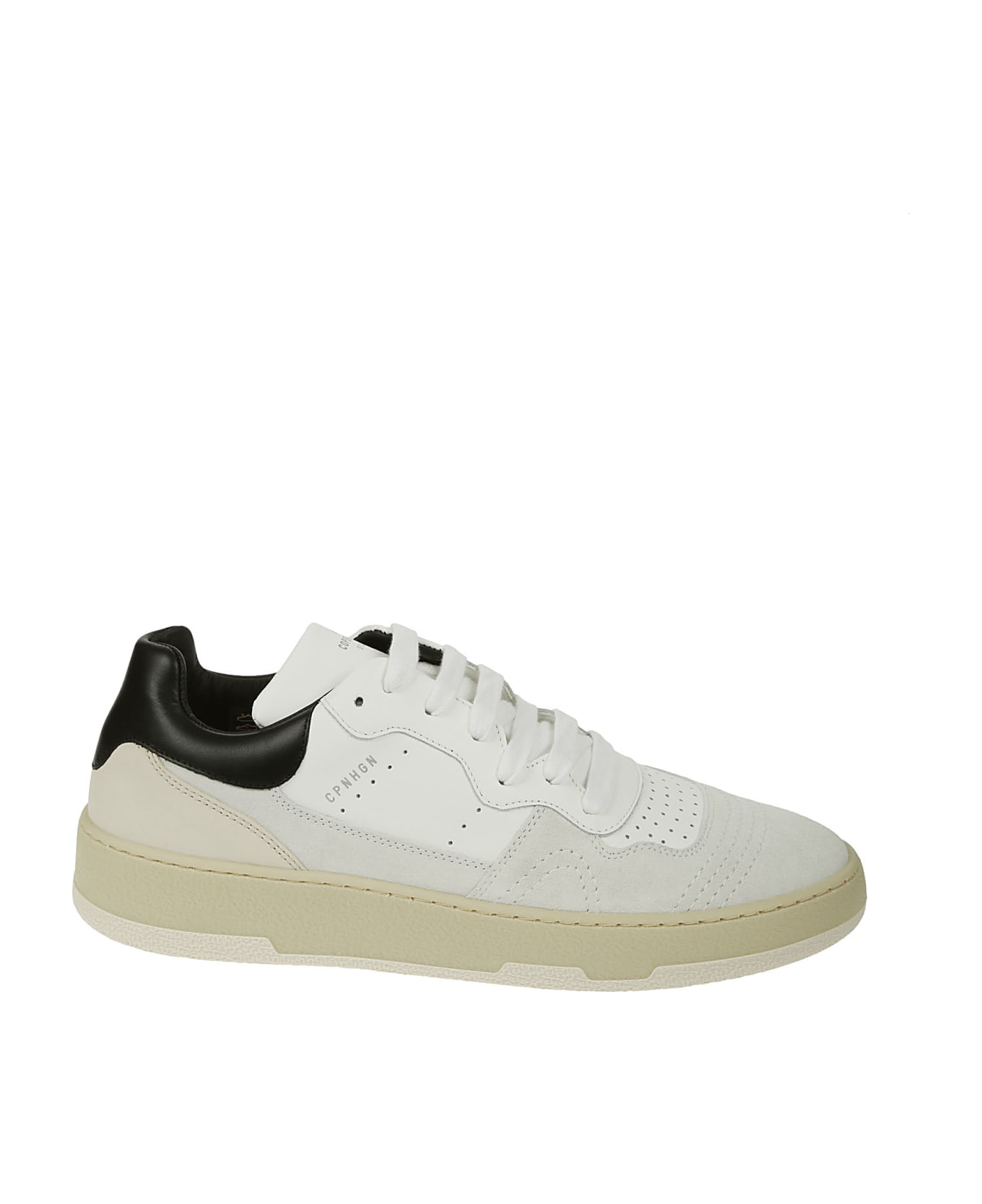 Copenhagen Sneaker in white leather, suede inserts, black leather insert on the back, rubber sole.