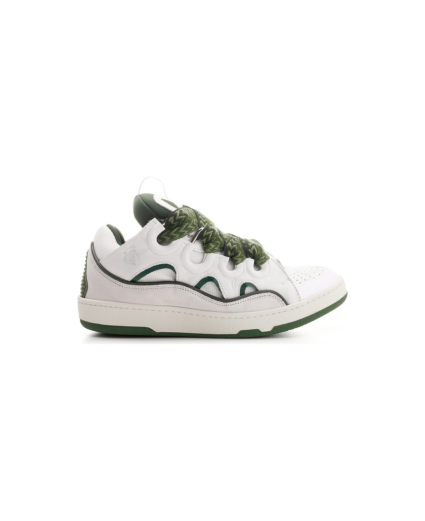 White and khaki leather "Curb" sneakers from Lanvin inspired by the 90s, made in nappa calf leather, suede and mesh. Rounded shape, padded tongue, curved metal eyelets, Double waxed and woven herringbone laces, rubber sole.