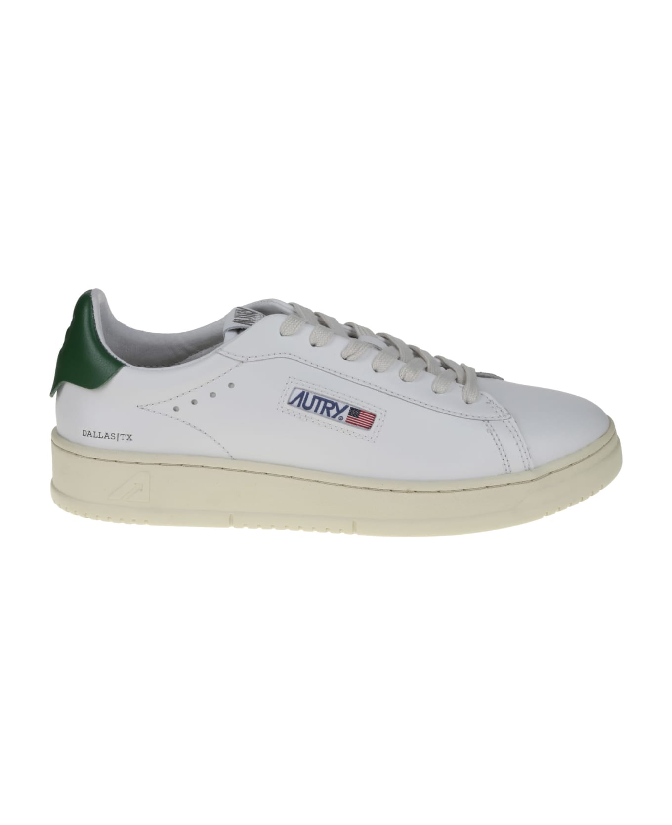 Autry Sneaker in white leather, green leather insert on the back, rubber sole.