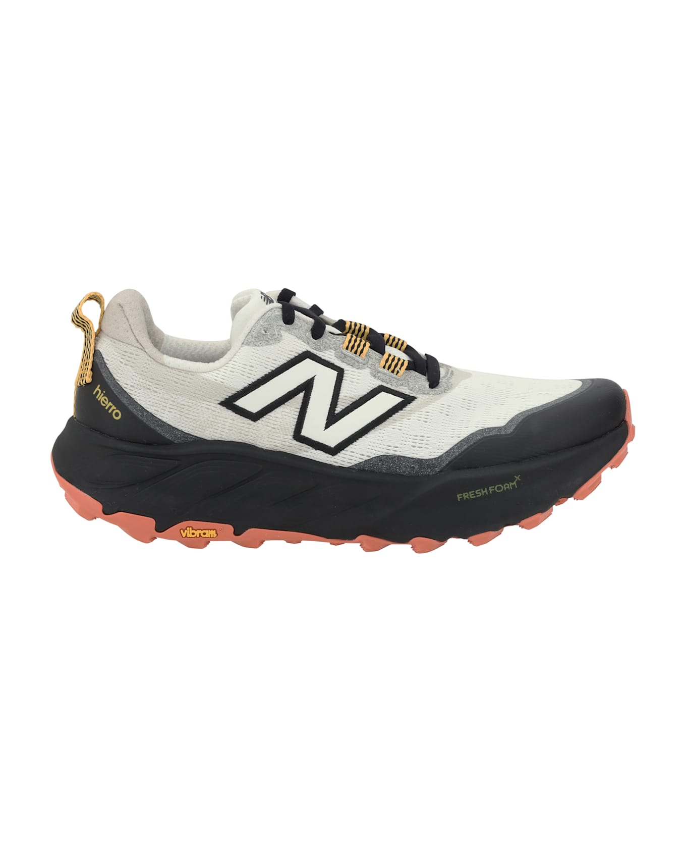 New balance's fresh foam x hierro v9 sneakers offer the perfect combination of performance and comfort for outdoor adventures. the lace-up closure ensures a secure fit, while the vibram® megagrip lugged outsole provides excellent grip on rough terrain. the reinforced toe and gusseted tongue contribute to optimal protection, preventing debris from entering. the pull-tab on the back facilitates fit, while the breathable mesh and synthetic upper with molded overlays provides lightweight durability. the brand's iconic logo at the sides completes the sporty and distinctive design.