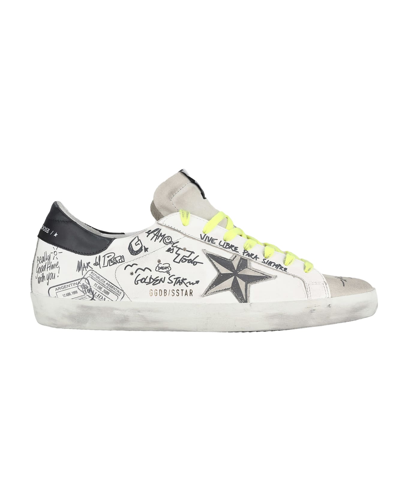 White Leather Superstar Sneakers With Graffiti By Golden Goose. Featuring: - Round Toe; - Lace-up Front Fastening; - Logo Patch At The Tongue; - Signature Star Patch To The Sides; - Contrasting Heel Counter With Logo Print; - Graffiti Print All-over; - Flat Rubber Sole; - Aged Effect.