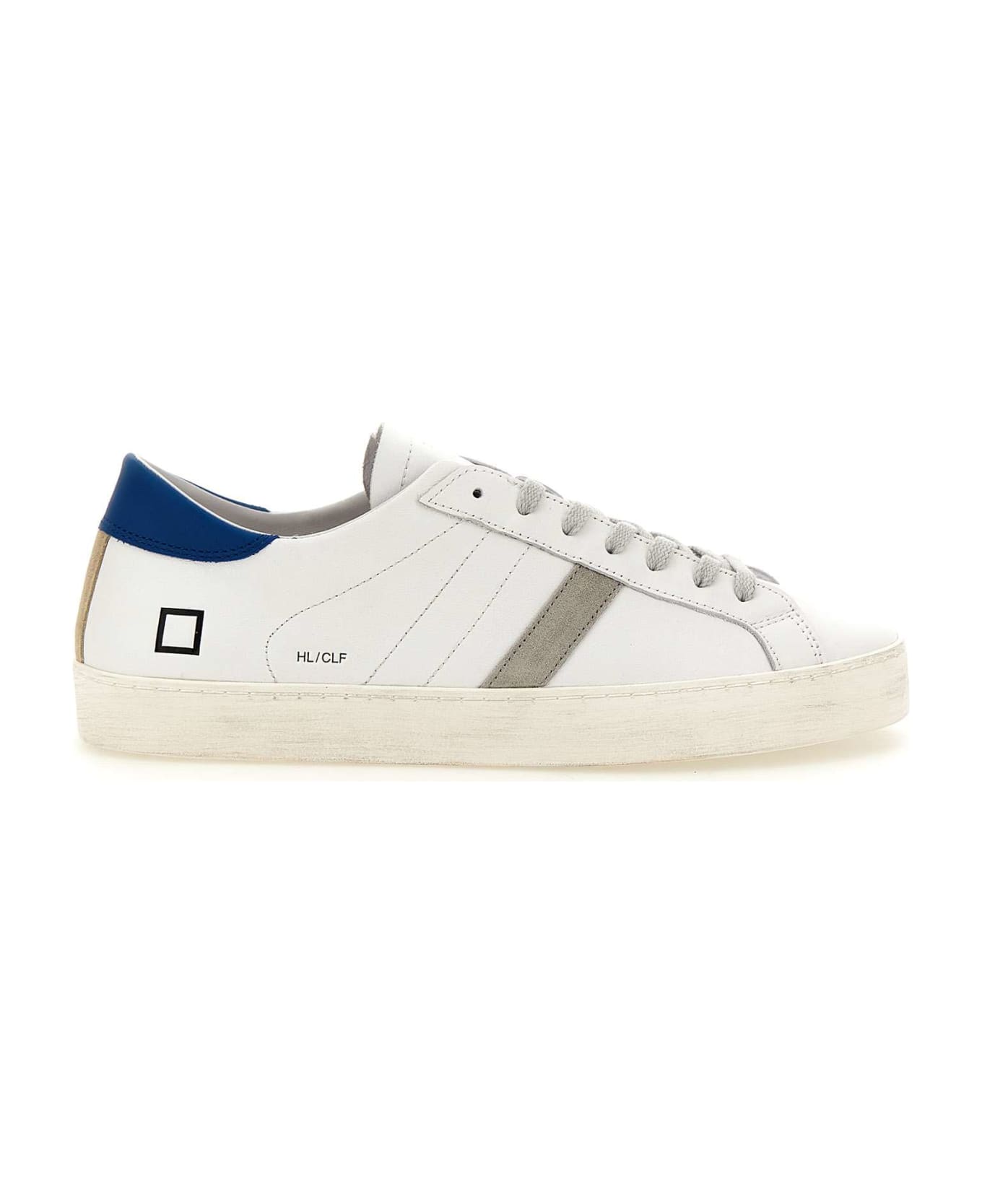 D. A. T. E "Hillow Calf" men's leather sneakers, white with gray details, flat laces, logo on tongue, contrasting bluette back patch, side square logo, light gray side band, leather and cotton terry lining, 2. 5 cm internal fussbett, 3cm high used effect rubber sole.