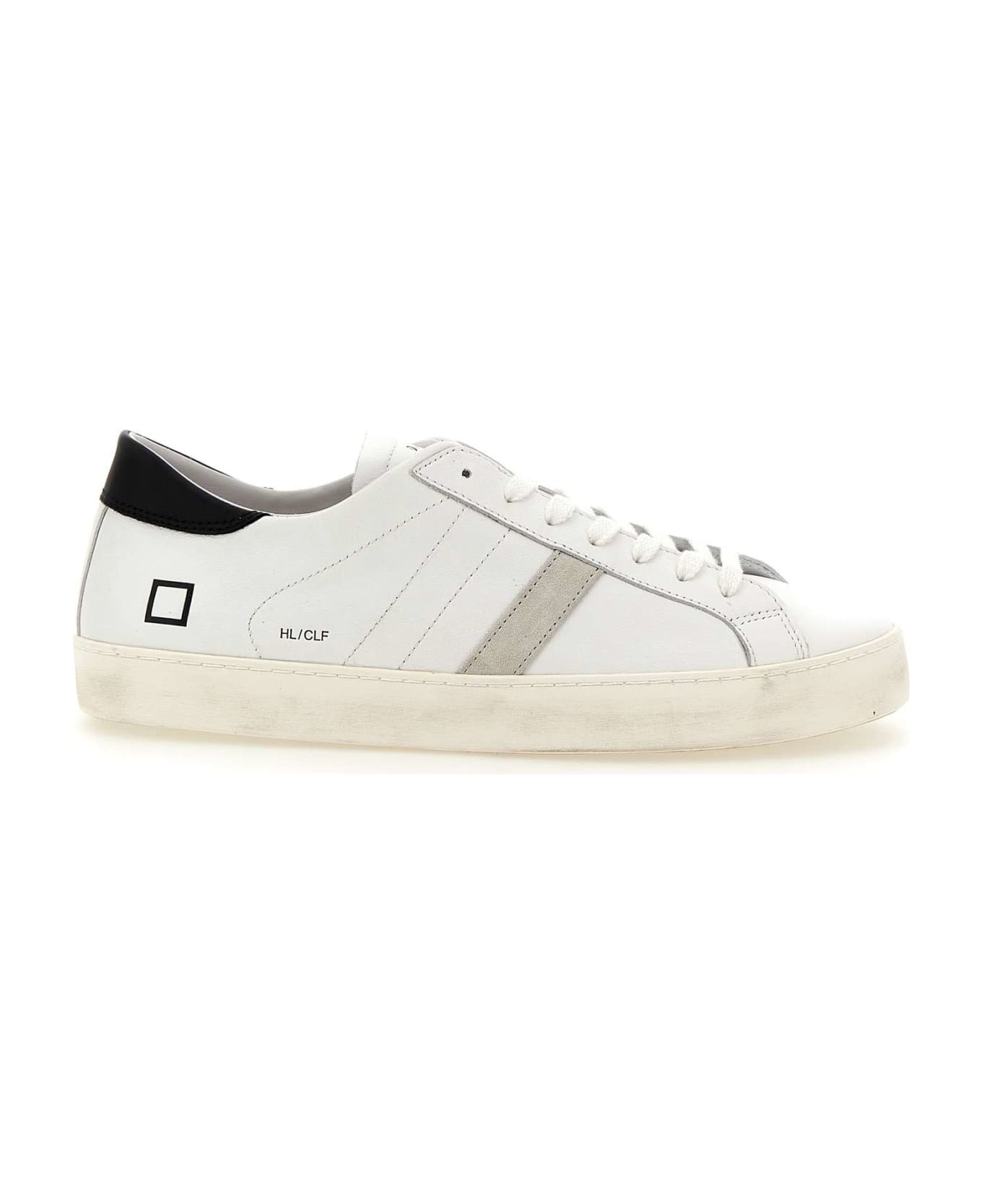 D. A. T. E "Hillow Calf" men's leather sneakers, white, flat laces same color, logo on tongue,contrasting black back patch, side square logo, light grey side band, leather and cotton terry lining, 2. 5 cm internal fussbett, 3cm high used effect rubber sole.