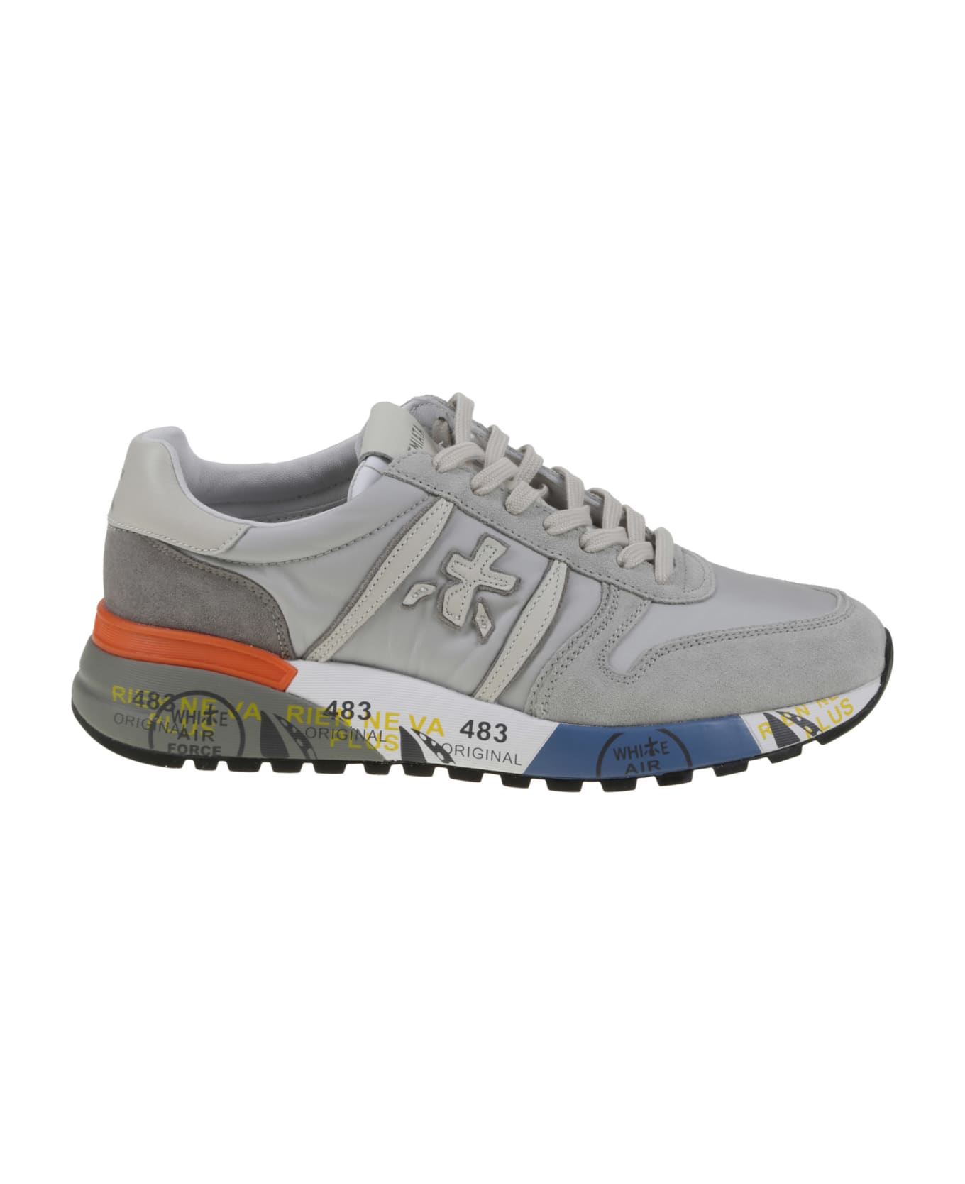 Premiata grey leather and suede sneaker with rubber sole with writings and logo detail on the side.