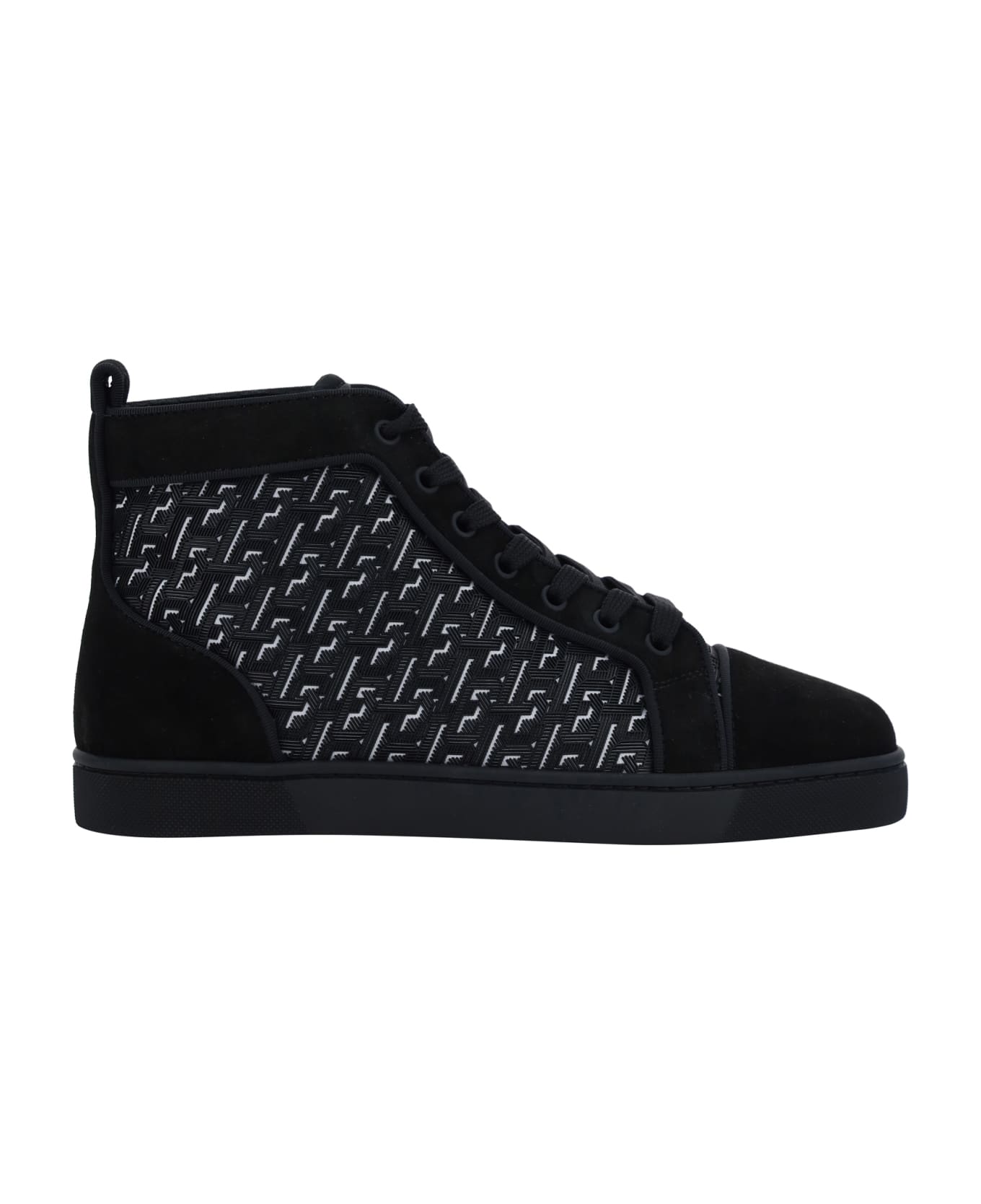 Louis orlato sneakers by christian louboutin, patterned with iconic contrasting repeated logo, ankle-length design, rounded toe, suede finish, lace-up front closure, brand monogram embossed on outer side panel.
