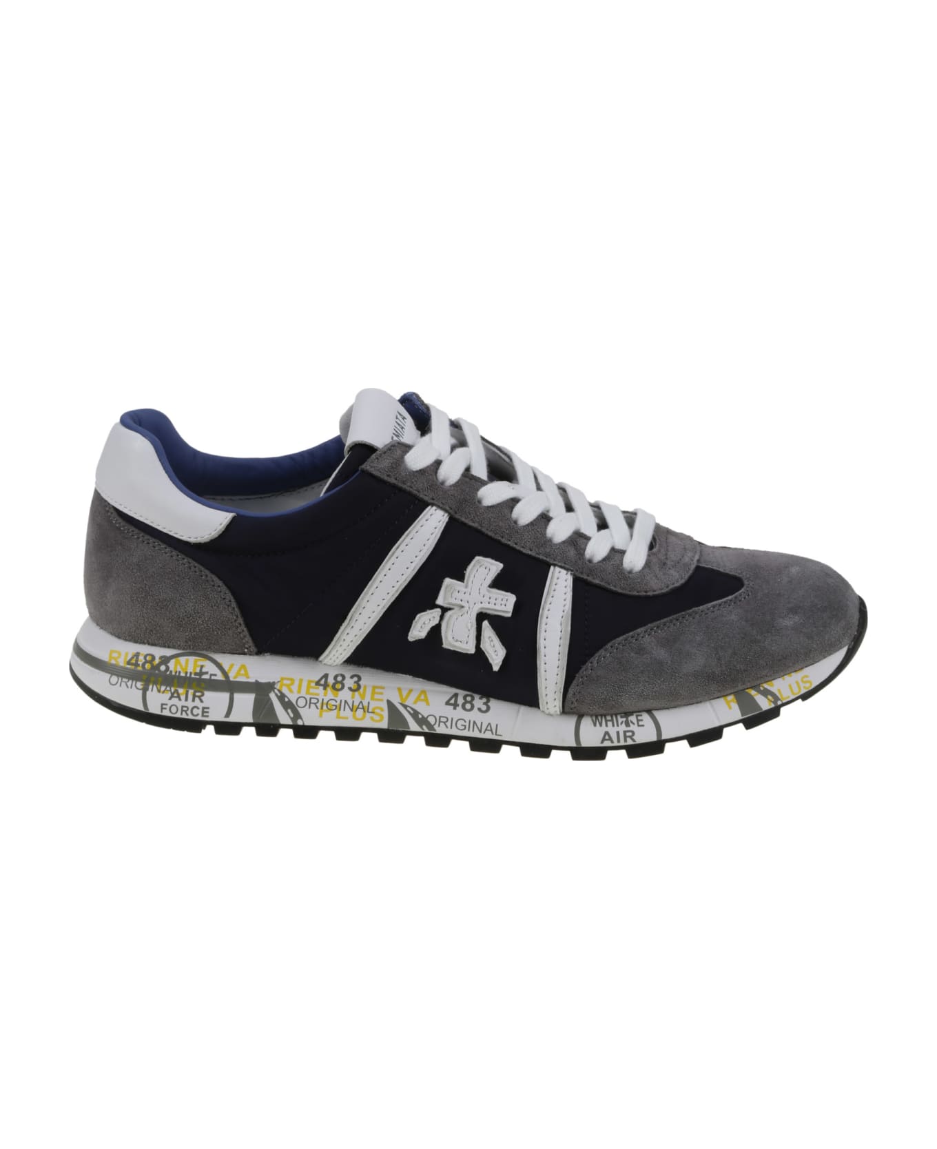 Premiata sneakers in nylon with suede grey inserts, white laces, rubber sole with writings, side logo detail.