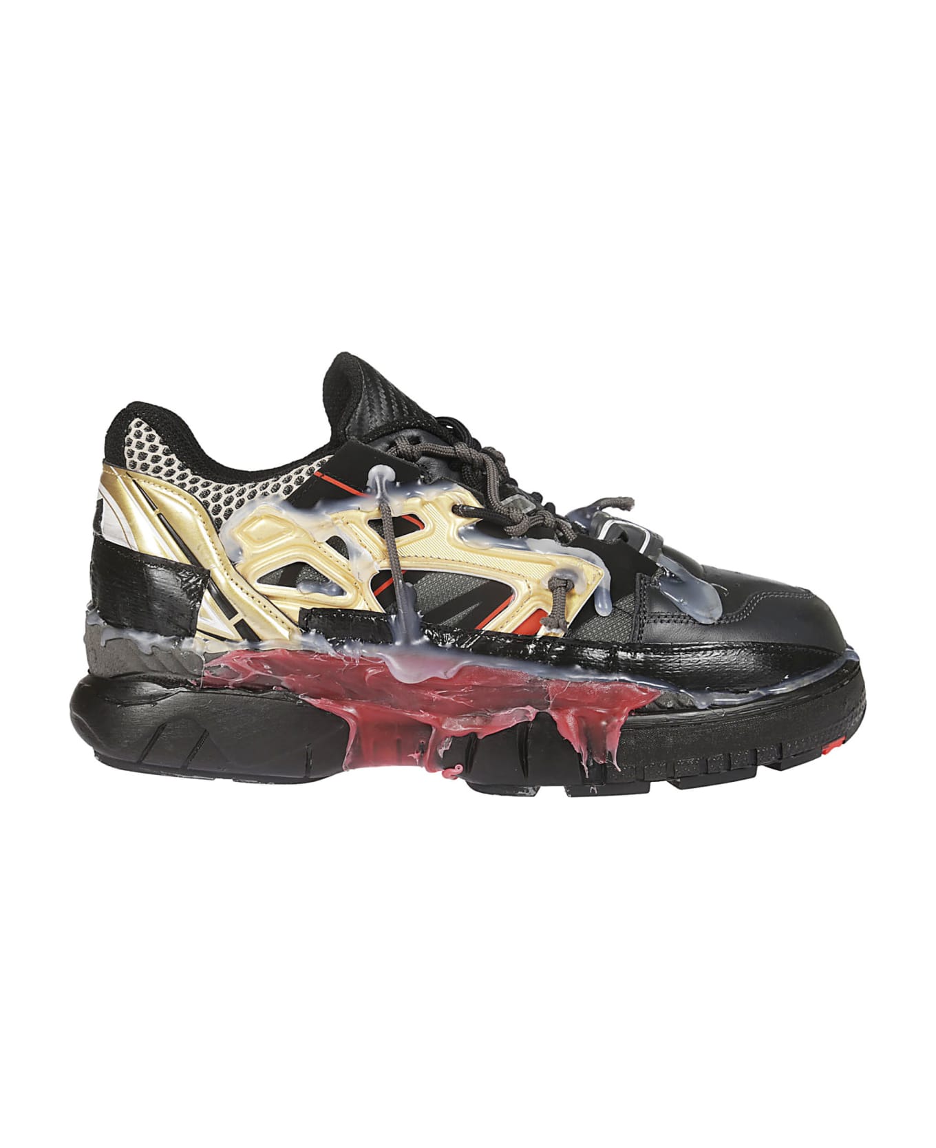 Fusion Mesh Sneakers from Maison Margiela: Black/Gold/Red Fusion Mesh Sneakers with mesh detailing, rubber sole, round toe, perforated detail and laced fastening.