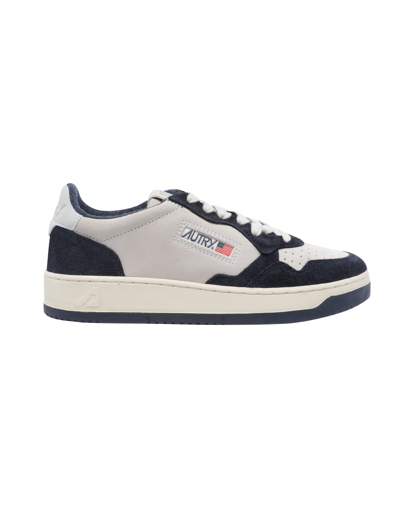 Autry white and black Medialist sneakers, suede and leather upper, laces closure, lateral and back logo, round toe