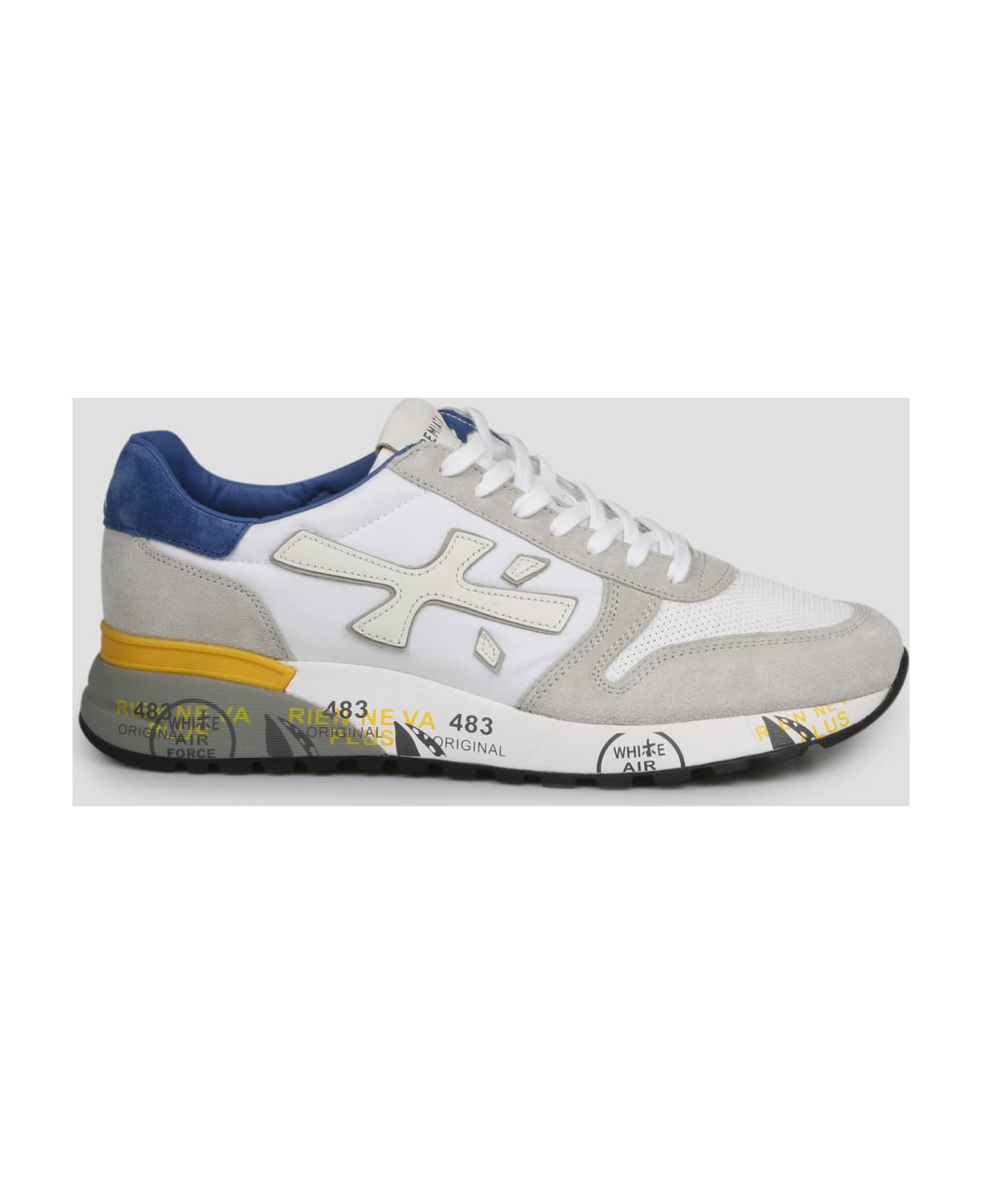 Mick sneakers by Premiata, in nylon and suede. - SS23 - Front in technical knit - Inserts in gray suede - Maxi logo in leather on the sides - Back insert in blue suede with logo print - Rounded toe - Lace up - Rubber sole with print - Made in Vietnam - 45% Polyamide, 40% Calfleather, 8% Polyurethane, 3% Nylon, 4% PVC