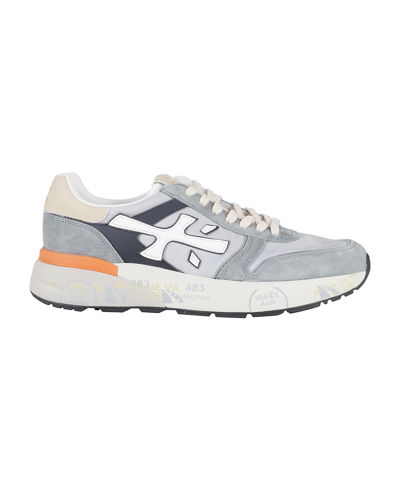 Mick sneakers - Premiata - Grey color - Technical fabric and suede upper - Round toe - Leather logo tongue - Contrasting logo-printed heel - Orange-colored cotton lace-up closure - Logoed rubber sole