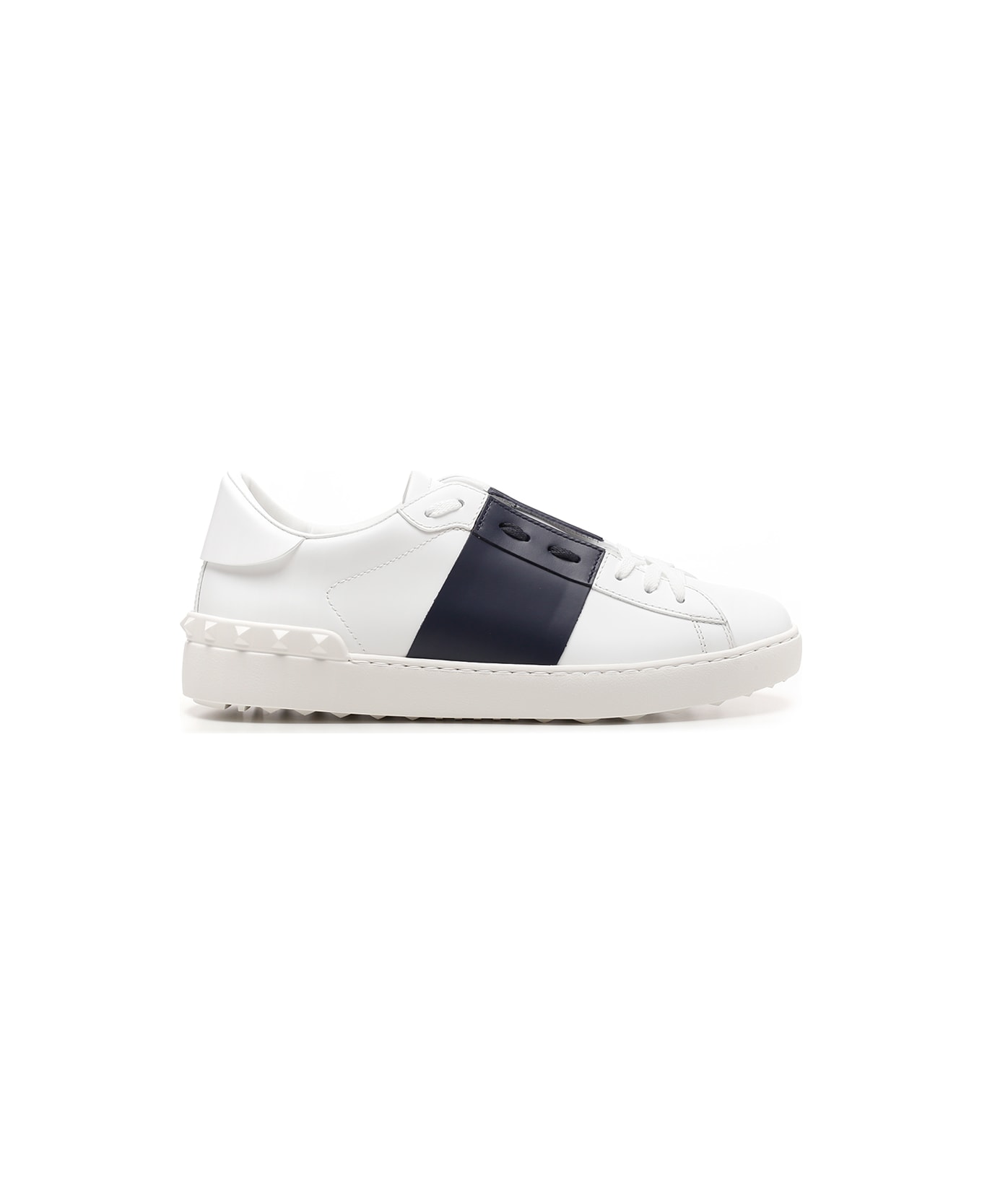 White "Open" sneakers from Valentino Garavani in white leather with rubber studs on the back and blue side band. Composition: UPPER: 100% Calf Leather; SOLE: 100% Rubber
