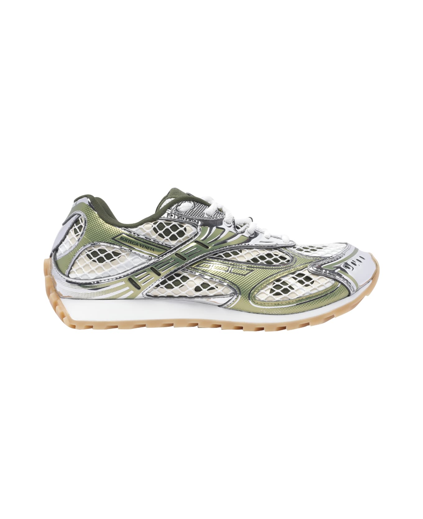 Bottega Veneta silver and green Orbit sneakers, round toe, fabric upper, electric colour