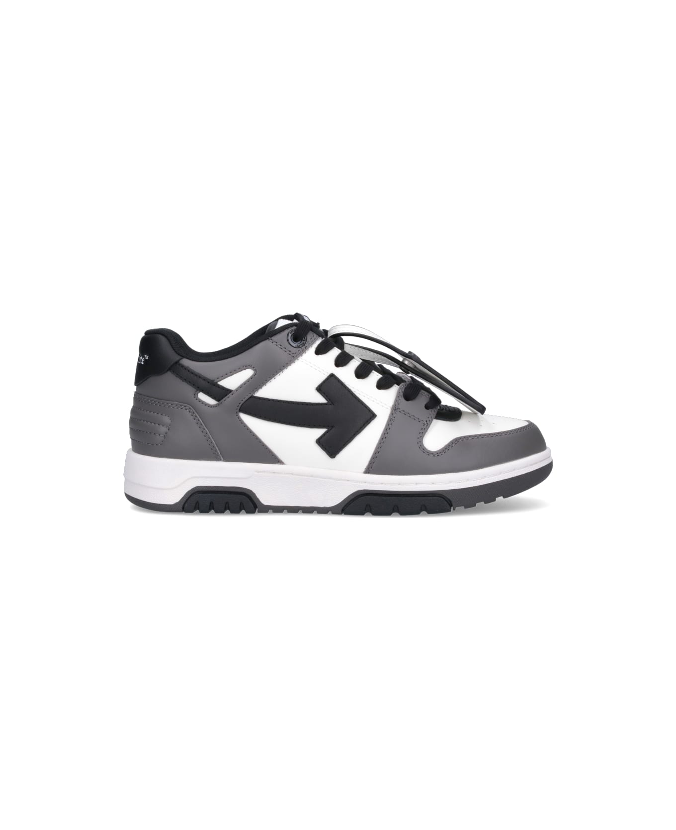 Off-White 'Out Of Office' sneakers in grey leather with black and white details, round toe, lace-up closure, iconic tag detail, side arrow logo patch, logo tab print, rubber sole.