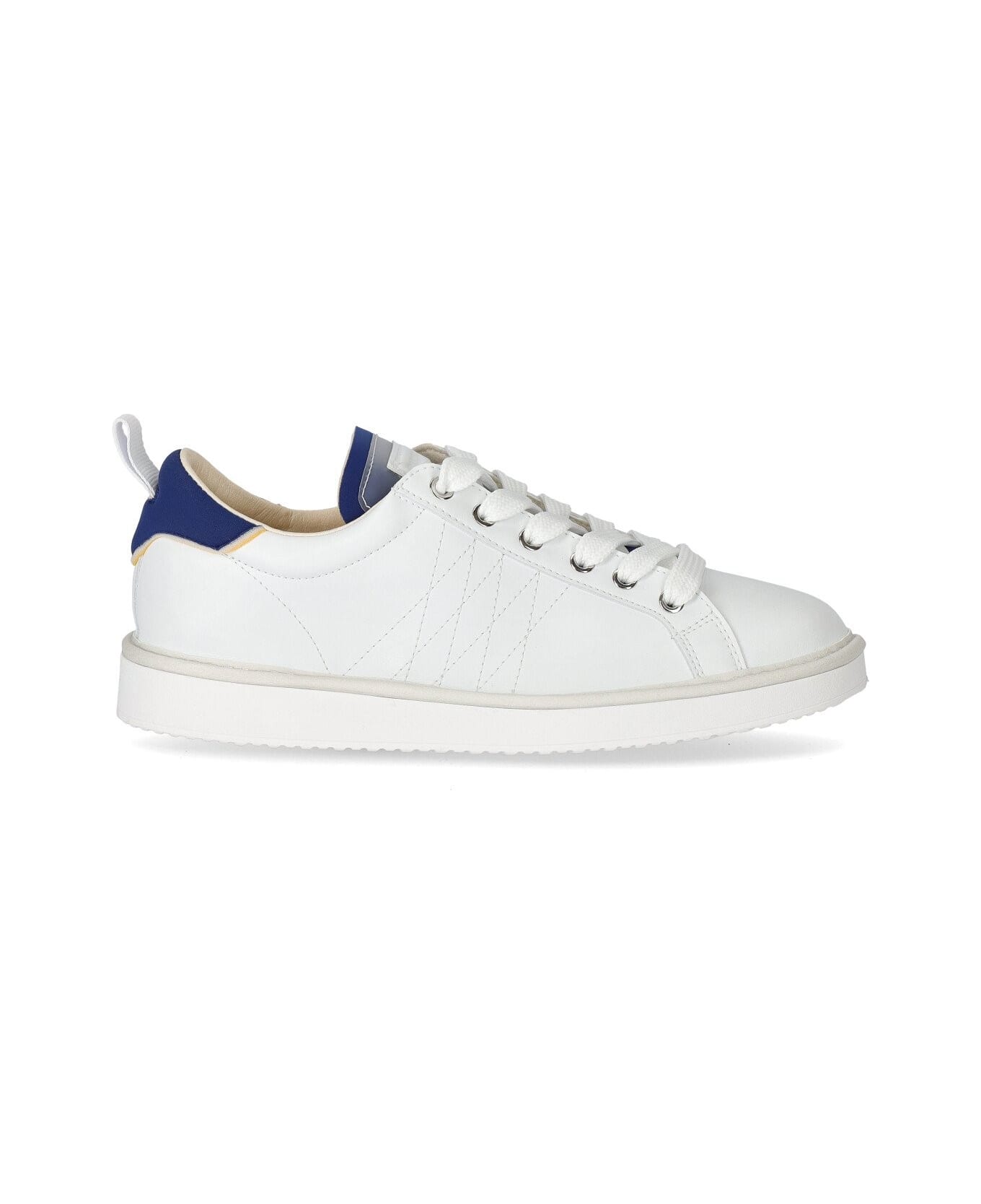 Panchic sneaker made of white faux leather, featuring blue neoprene inserts and sponge tongue with logo patch. Cotton lining, eco leather insole and white open-weave cotton laces. Rubber sole, height 3 cm. Also included is a pair of spare laces.