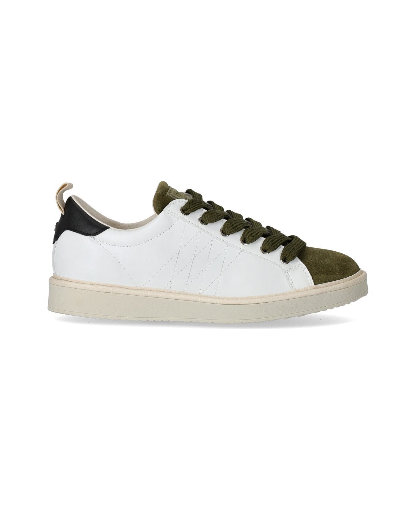 Panchic sneaker made of white imitation leather with sage green suede insert. Contrasting heel, cotton lining and eco leather insole. Logoed tongue, open-weave cotton laces. Rubber sole, height 3 cm. Also included is a pair of spare laces.