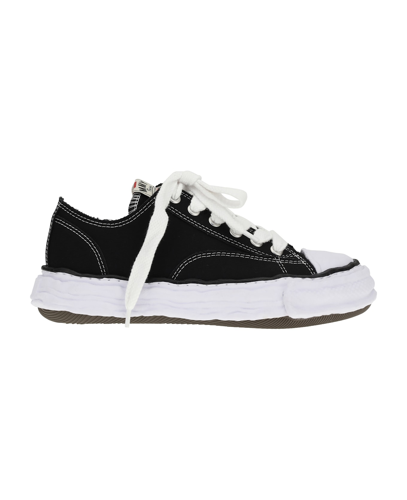 Maison mihara yasuhiro's peterson 23 sneakers feature a canvas upper embellished with contrast stitching that accentuates the minimalist design. the lace-up closure and logo patch tongue add a distinctive touch, while the white rubber sole completes the sleek and versatile aesthetic. a great choice for those seeking a casual yet sophisticated look.