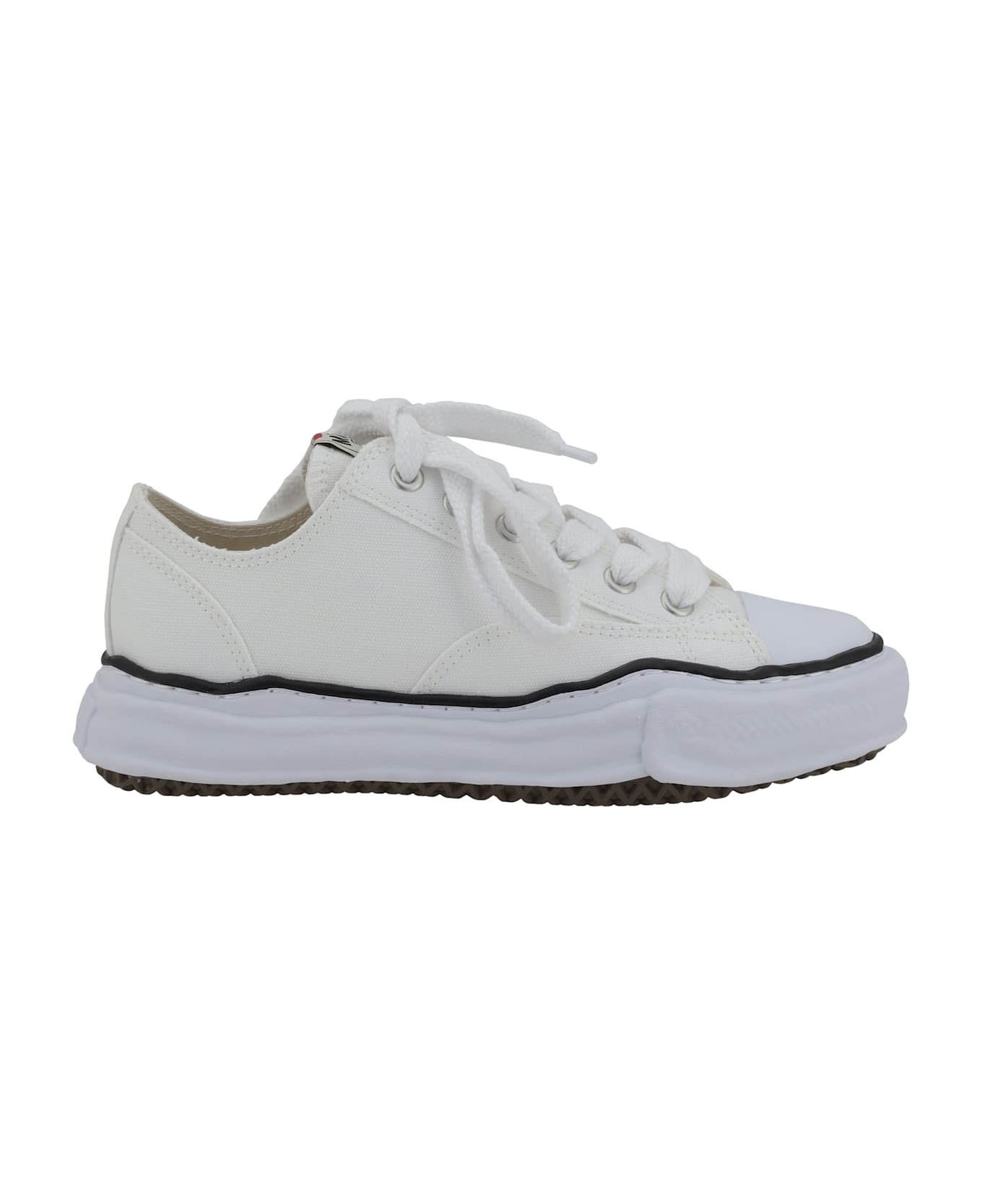 Maison mihara yasuhiro 's peterson sneakers feature a canvas upper embellished with contrast stitching that accentuates the minimalist design. the lace-up closure and logo-patched tongue add a distinctive touch, while the white rubber sole completes the sleek and versatile aesthetic. a great choice for those seeking a casual yet sophisticated look.