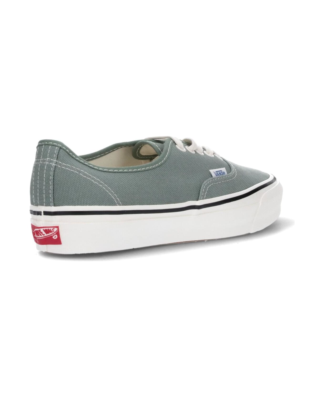 Vans premium Authentic 44 sneakers in green cotton with black trim, round toe, laces, side logo label, rubber sole, and back logo patch detail.