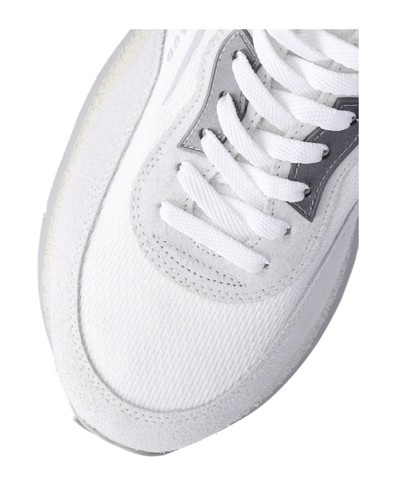Ghoud 'rush' sneakers, white mesh, gray suede details, round toe, lace-up closure, logo tab on the tongue, side logo print, contrasting back tab engraved logo detail, and a rubber sole.