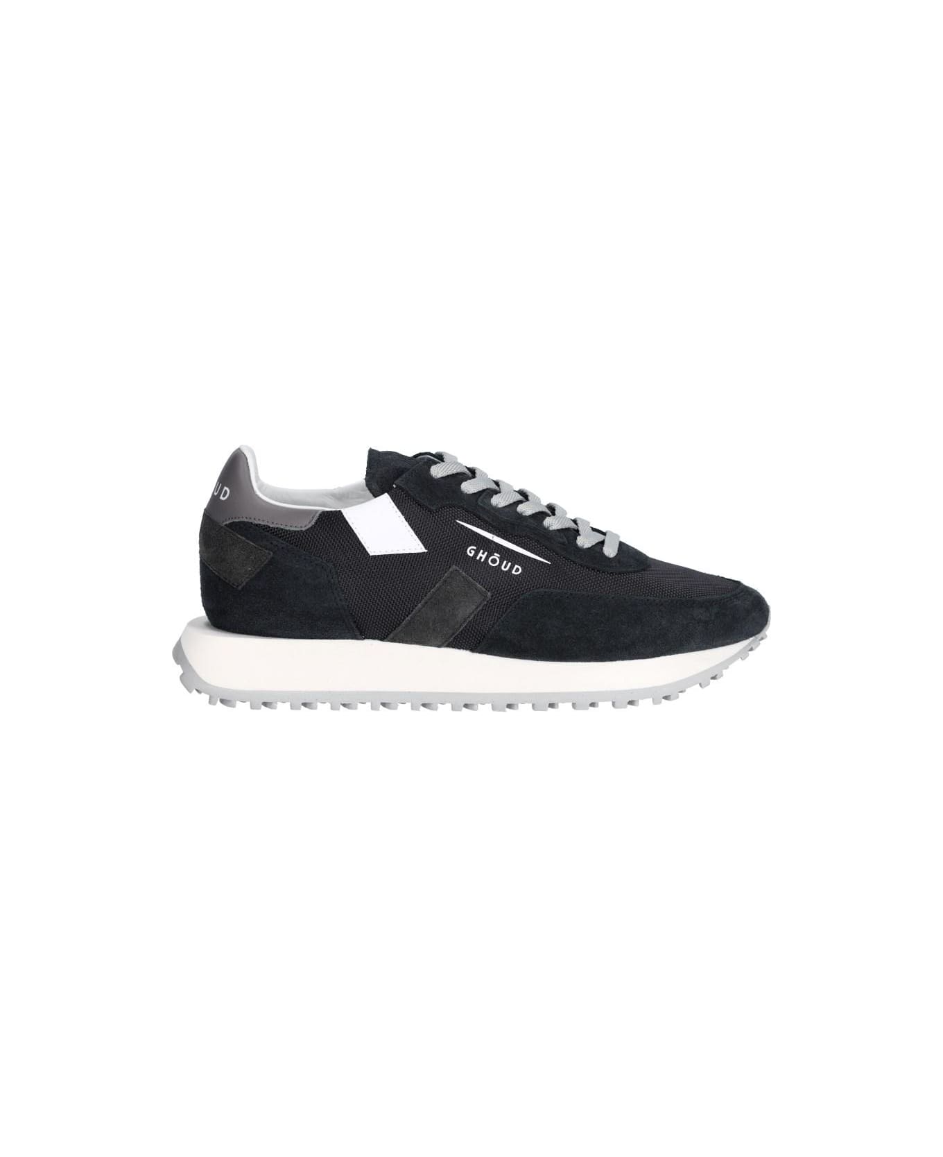 Ghoud 'rush' sneakers, black mesh and suede, gray details, a round toe, lace-up closure, logo tab on the tongue, side white logo print, contrasting back tab logo detail, and a rubber sole.