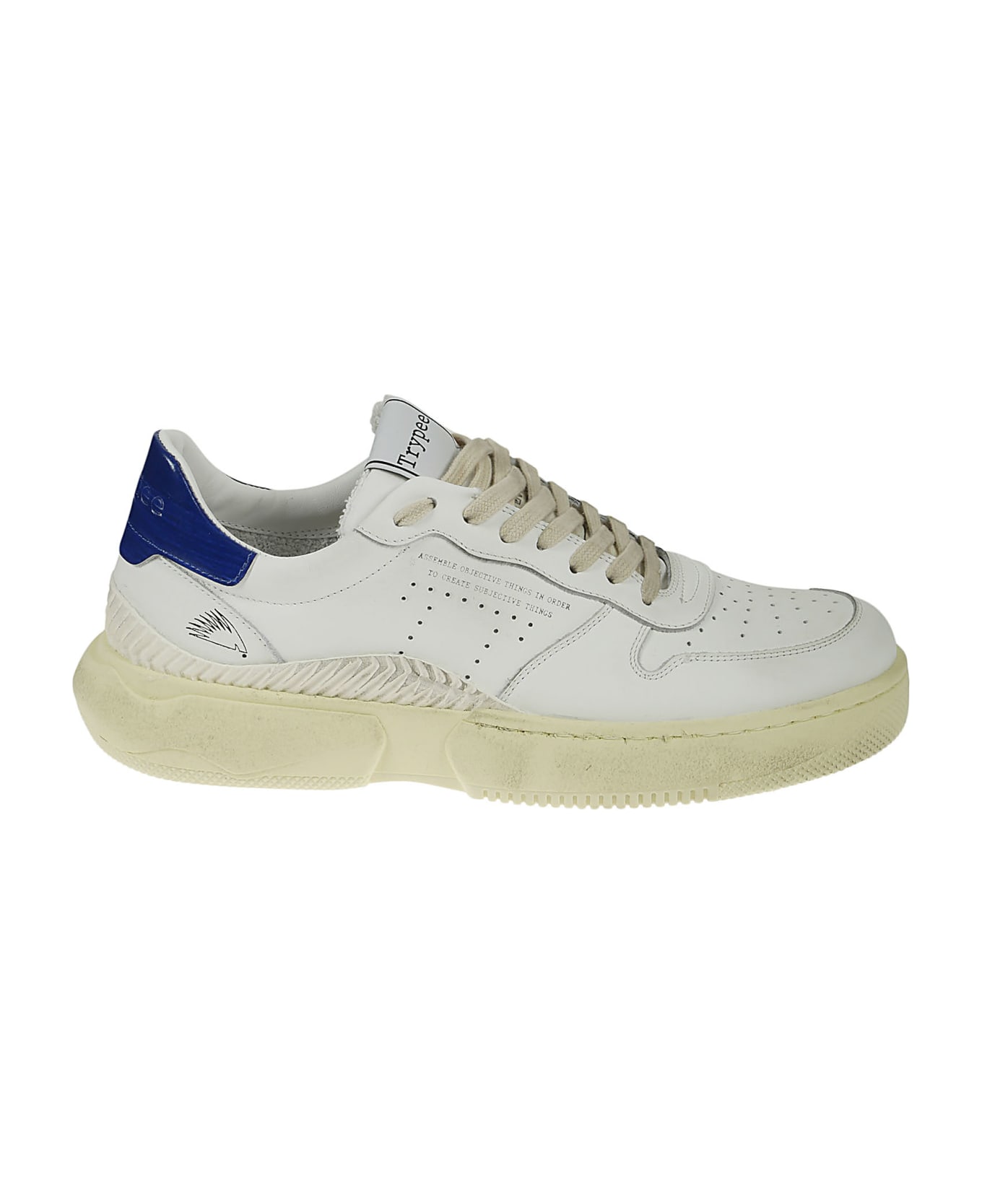 Trypee Sneakers in white leather, perforated toe, royal blue insert on the back, rubber sole, logo on the tongue.