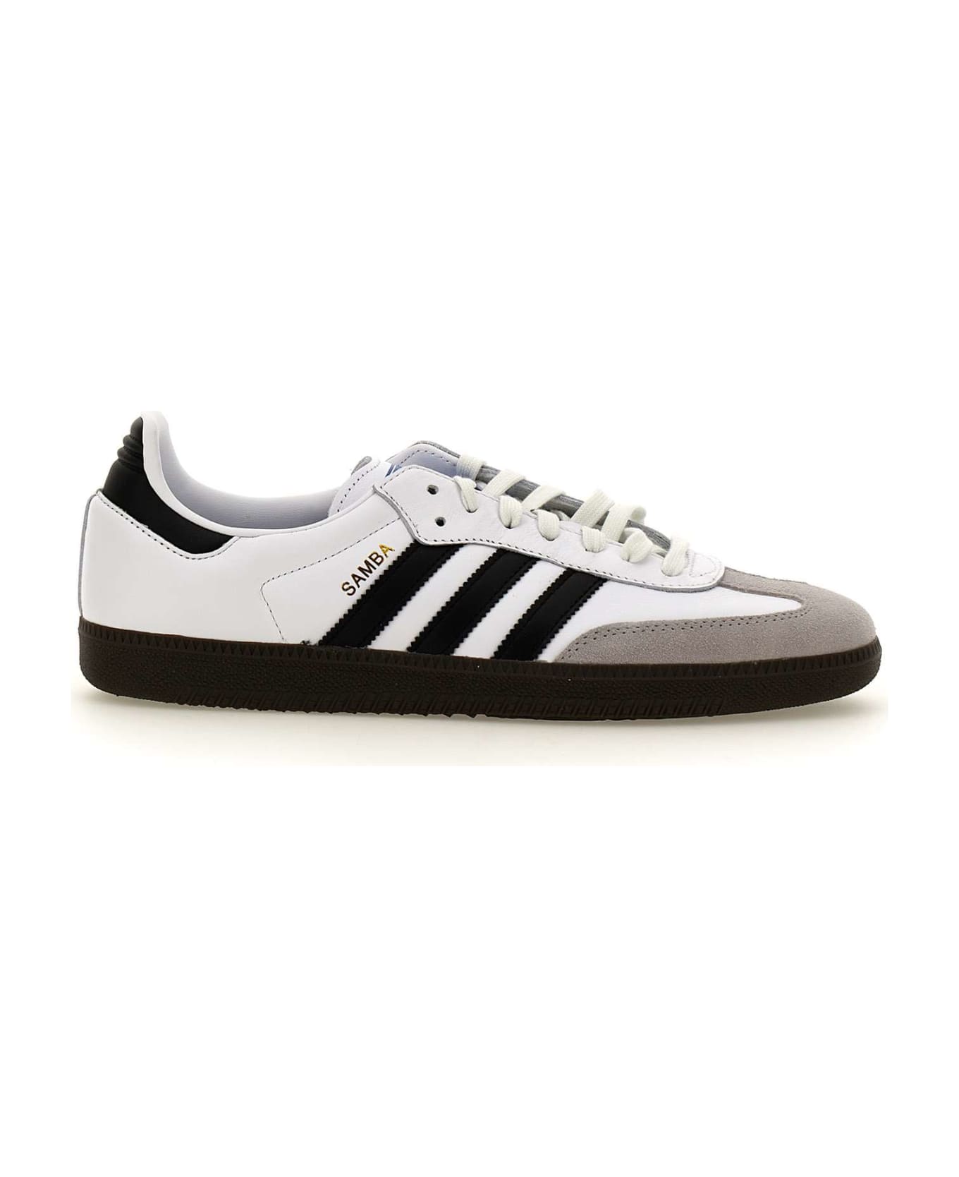 Adidas 'Samba' men's leather with grey sneakers, black and white suede inserts, old school design, white flat laces, gold-colored logo on tongue and side, iconic side bands, dark brown rubber sole 2cm high.