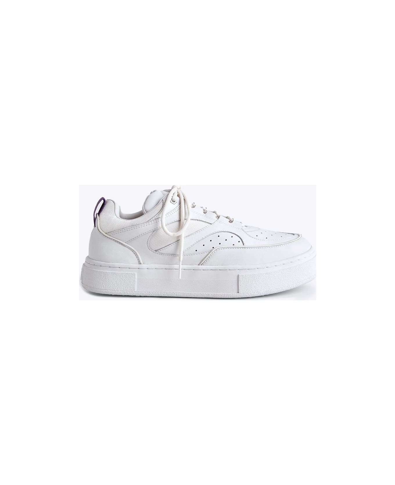 White leather lace-up low sneaker. Perforated upper detail. Puffy tongue with rubber logo. Back purple puller. White rubber sole. Composition: 100% leather. Made in Portugal.