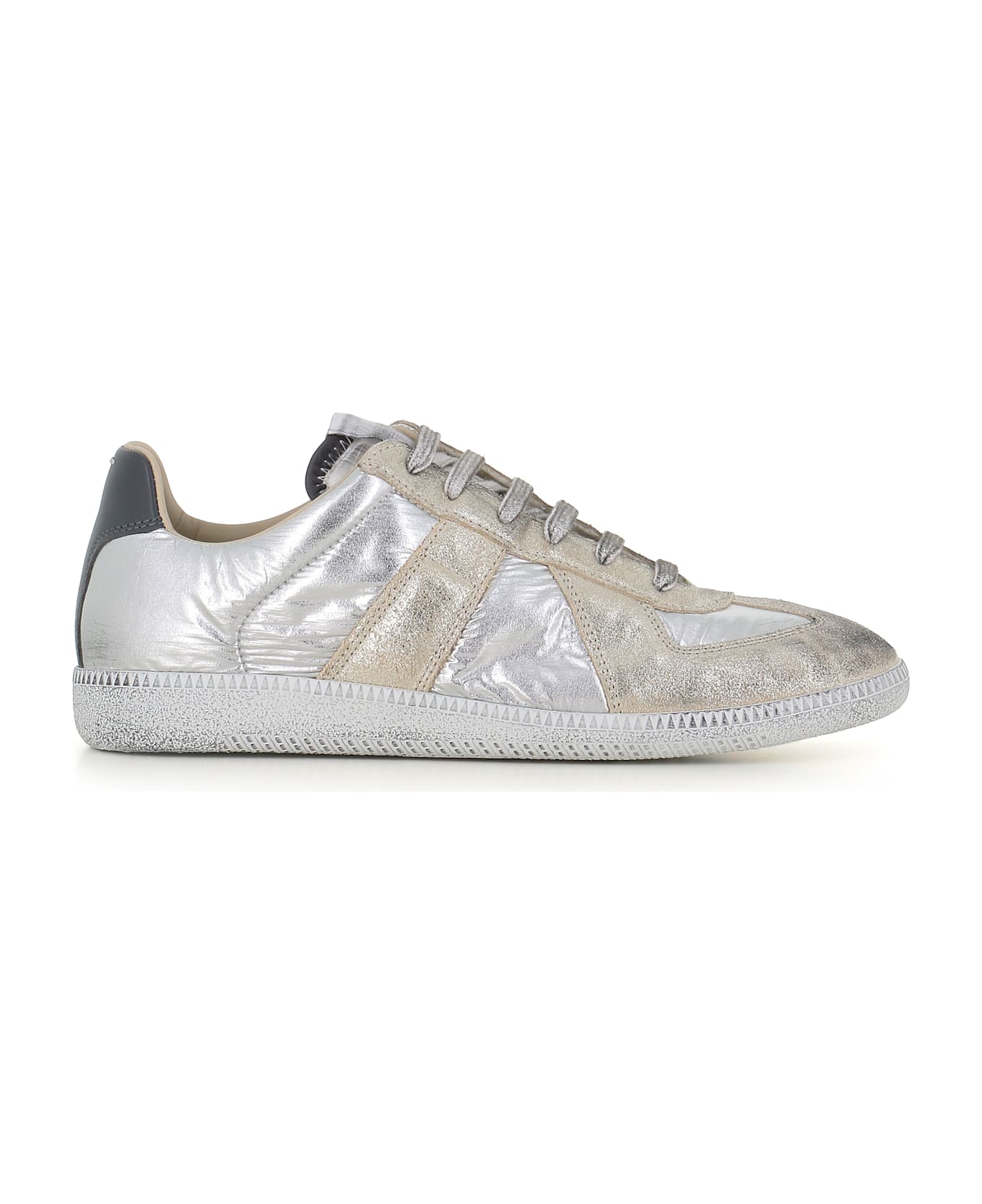 Silver leather men's trainers by Maison Margiela, featuring gold inserts, front lace-up fastening, flat rubber sole and single-stitch logo. Lined interior. Heel: 2,5 cm Composition: Leather