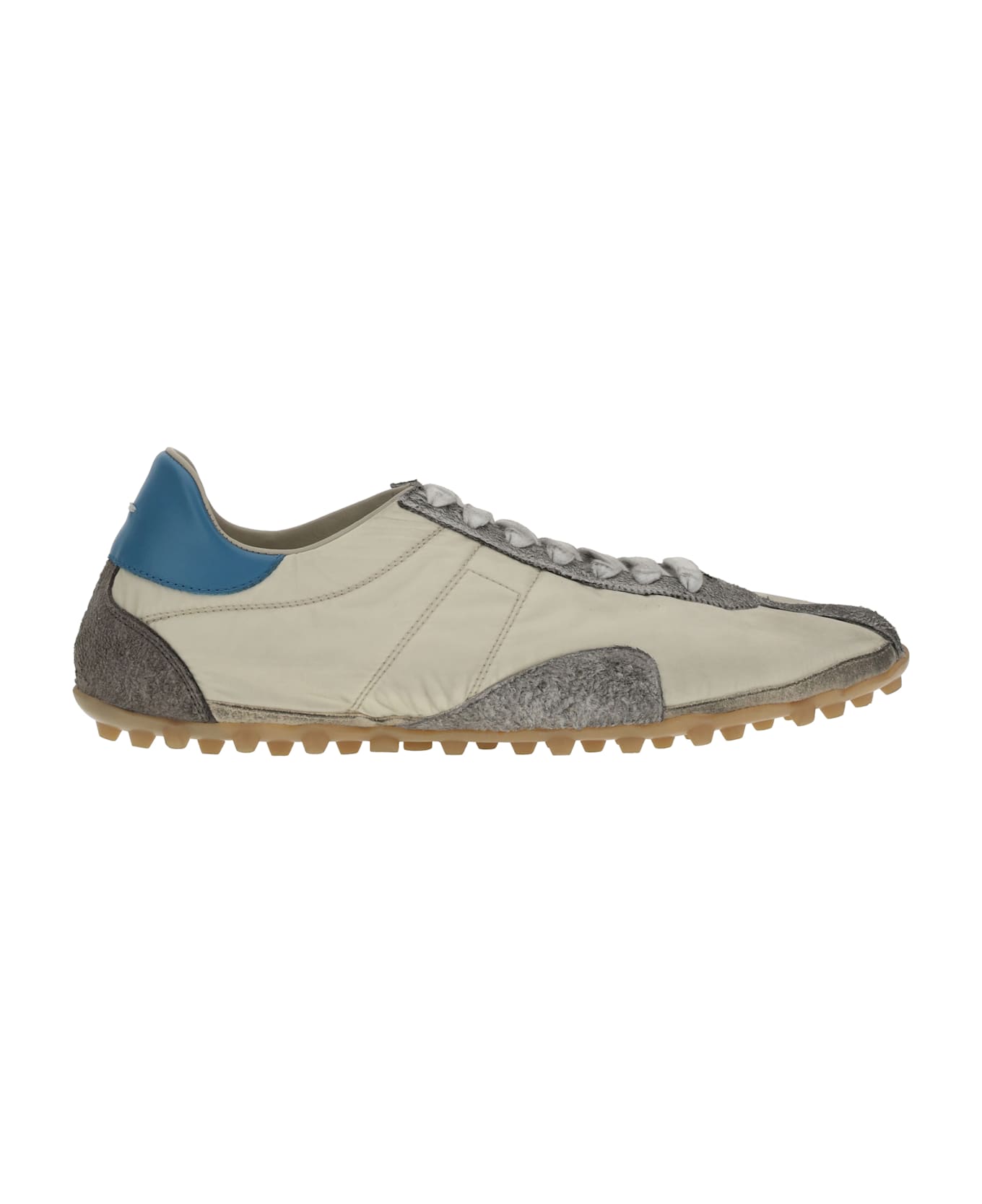 Maison margiela's sprinters sneakers are inspired by retro running shoes, reworking the sporty design with a modern, sophisticated twist. the elongated toe and lace-up front closure give a dynamic silhouette, while leather and suede details add a rich, refined texture. the flat sole with cleats provides comfort and stability, while the vintage treatment gives the model a unique and authentic look. the back features the maison's signature classic topstitching, which completes the look with a hint of craftsmanship.