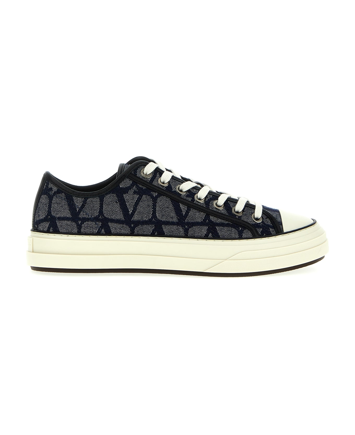 Toile iconographe' denim sneakers with all-over logo, low model with rubber sole and laces. Composition: 87% cotton, 13% polyester
