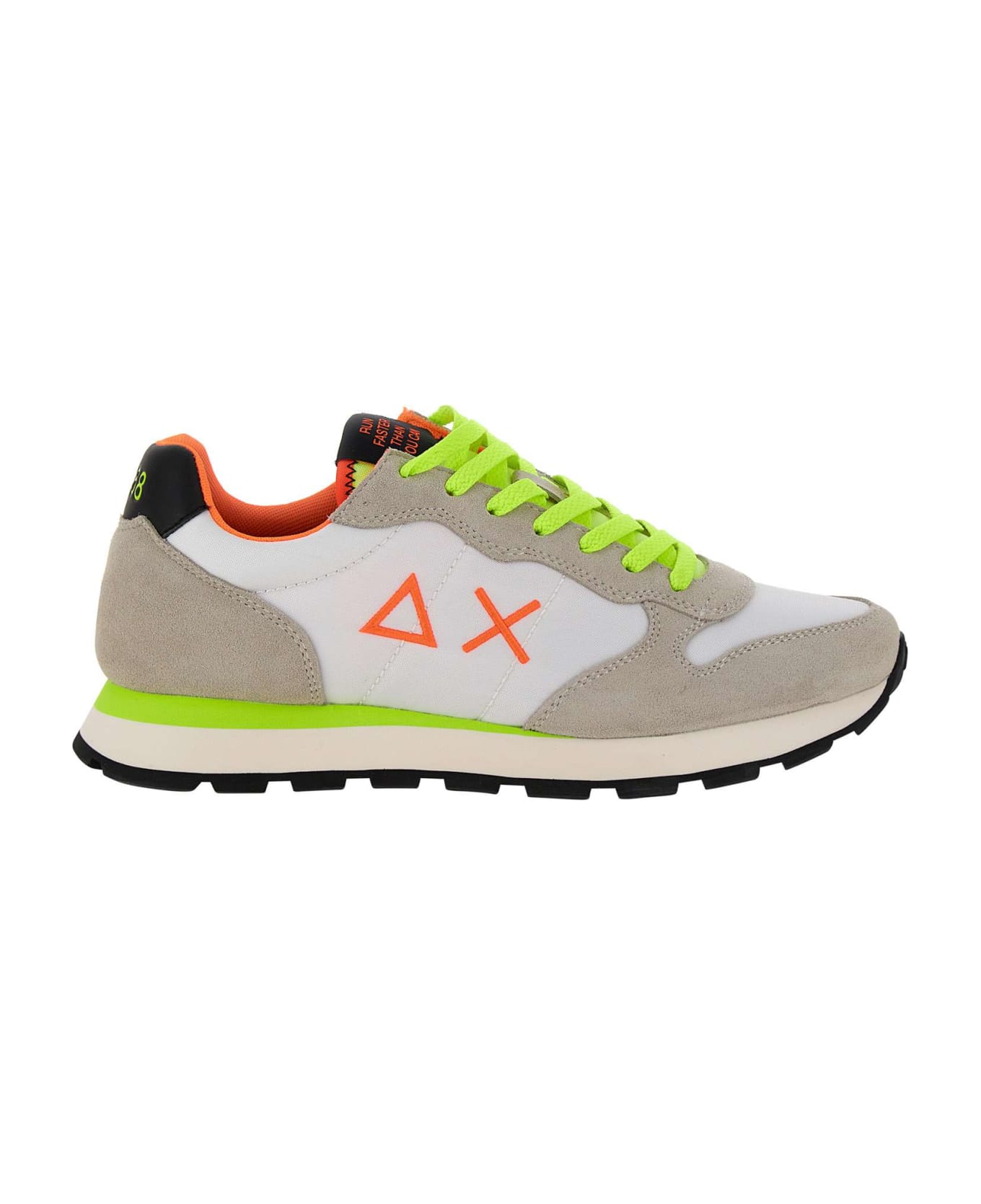 Sun68 "Tom Solid Fluo" men's sneakers, white with multicolor details on heel, tongue and sole, made of mesh and technical fabric, contrasting fluorescent yellow laces, logo on heel and side, "Run faster than you can" writing on black tongue , fluo orange interior, two-tone white and orange sole in 3cm high ultralight rubber.
