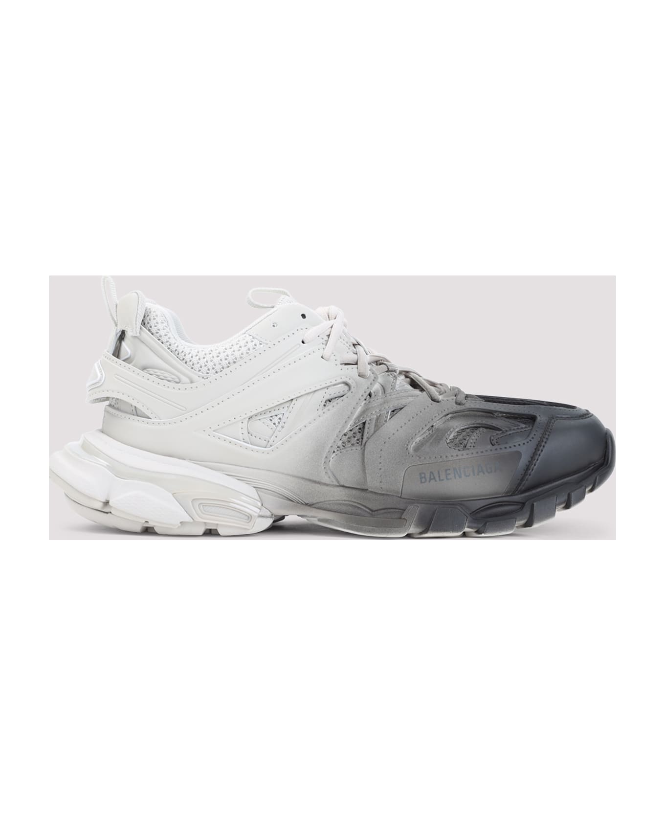 Balenciaga Black & White Track Gradient Sneakers. Crafted in polyurethane, polyester and polyamide blend. Round toe, top lace-up fastening, top mesh fabric, top tonal leather strap with cage design, side lettering logo, back patch logo, runner sole. Black and white gradient effect.