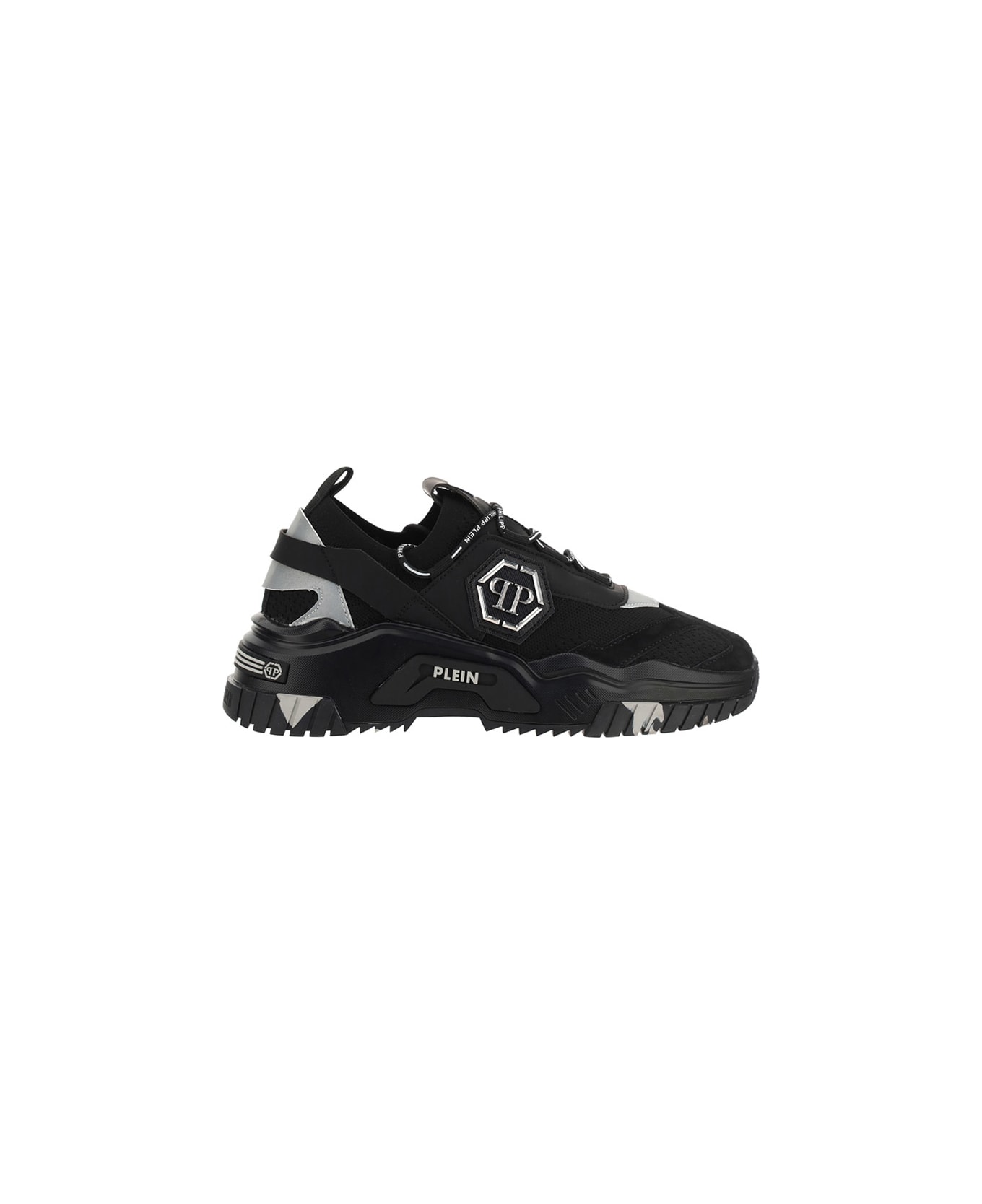 Calfskin trainer predator sneakers by philipp plein, paneled design, elongated toe on front, front closure with contrasting logo laces, patch with iconic three-dimensional brand logo applied on side panels, suede details, logo insole and high sole.