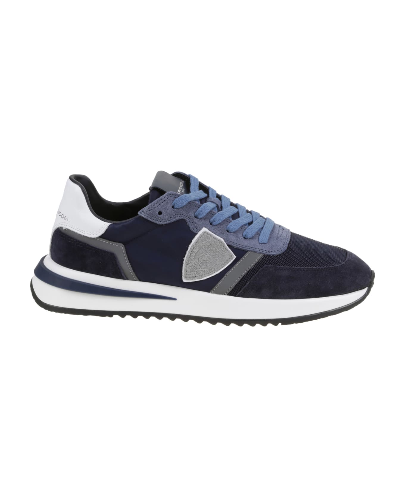 Philippe Model Sneaker in blue suede and nylon, white leather insert, rubber sole, logo detail.