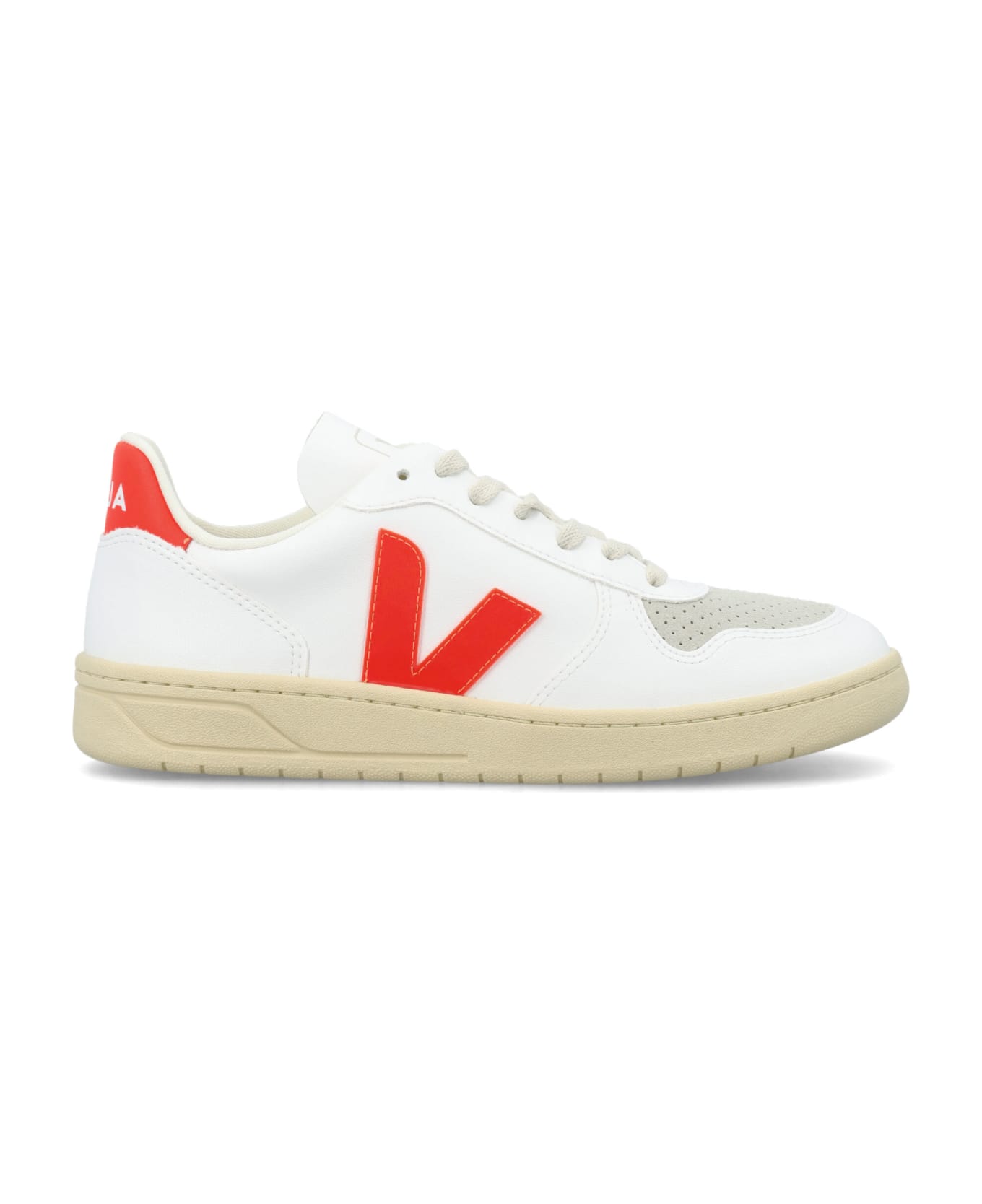 Vegan Leather V-10 Sneakers By Veja. Featuring: Round Toe With Perforated Vegan Suede Panel Lace-up Closure Orange Fluo V Applied At Side Logo Print At Tongue Orange Fluo Heel Counter With Logo Print Flat Rubber Sole